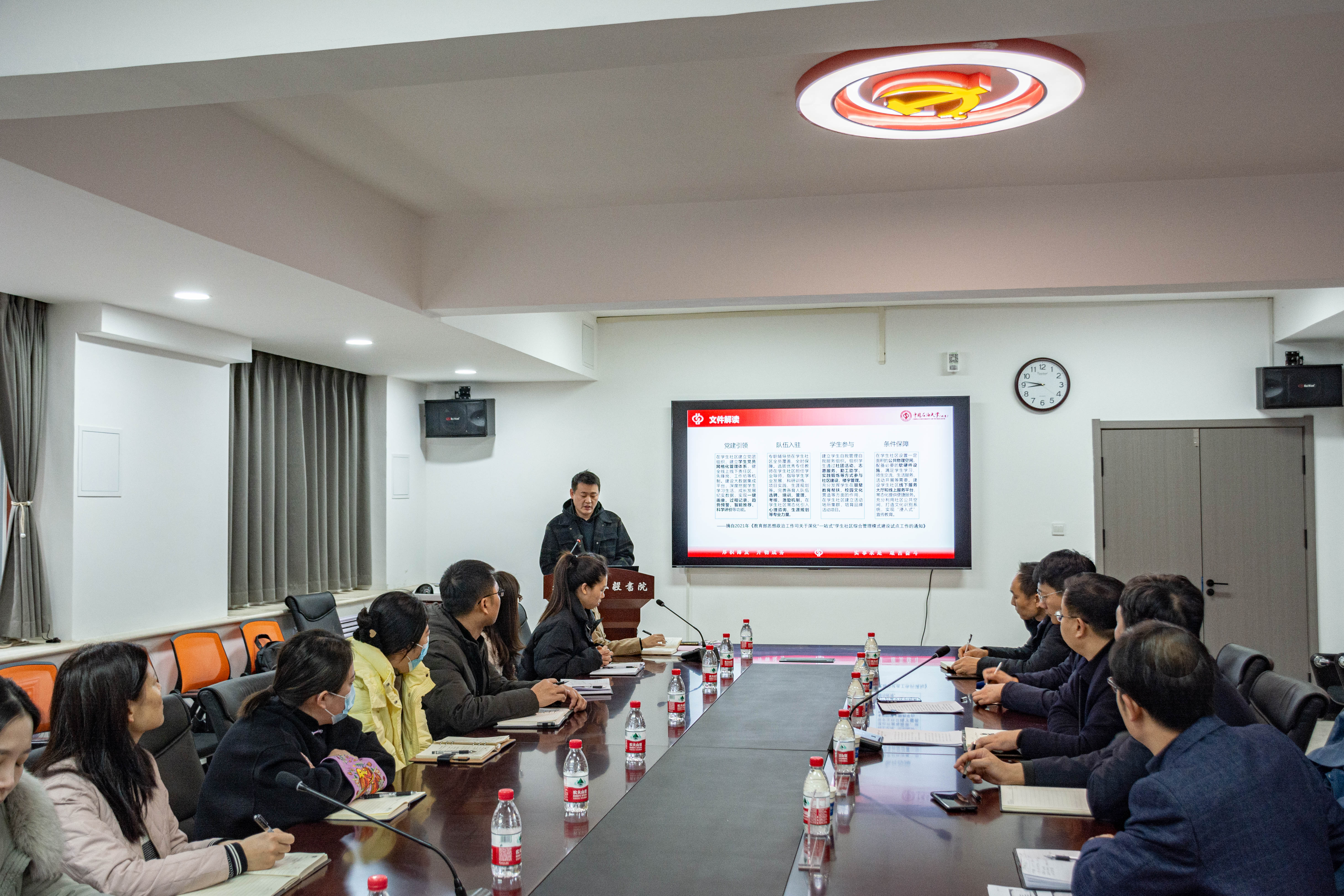 本次会议由三位赴北京、广东、安阳学习的老师做了交流发言。与会老师分享了北京大学、中国人民大学、中国石油大学等“一站式”学生社区综合管理模式建设经验,南方医科大学通识课程教育与发展模式及全国高校样板党支部建设等相关内容,就相关问题与会老师进行了深入探讨和交流。