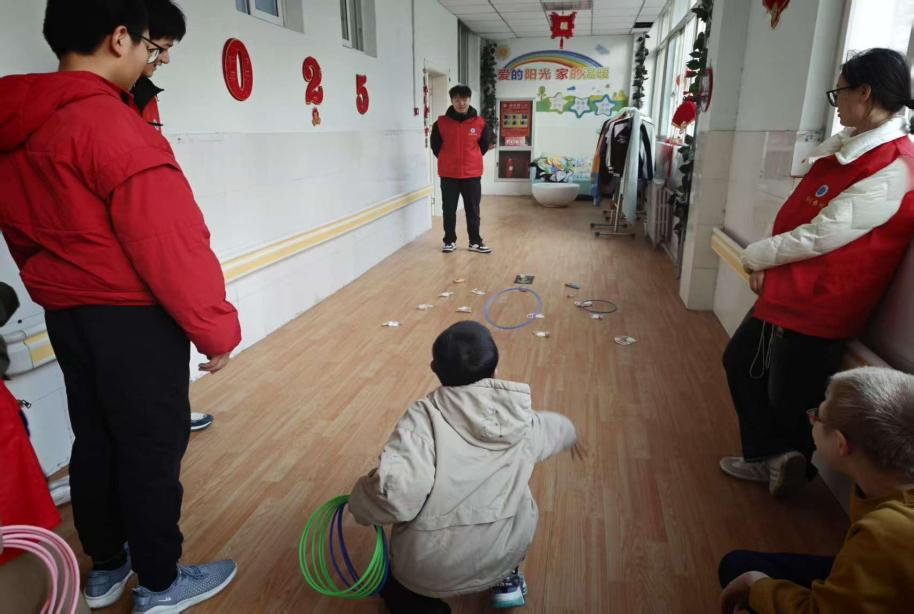 扭扭棒手工坊与室内套圈竞赛将现场气氛推向高潮。色彩缤纷的扭扭棒在孩子们灵巧或略显笨拙的手中,变幻出花朵、戒指等生动造型;套圈场地中,每一次专注瞄准与精准命中都引来阵阵真诚的欢呼。志愿者们耐心地讲解、手把手地辅助,这个“共创”的过程,成为传递手温、眼神、鼓励和喜悦的载体。学生们深刻体会到,温暖人心的服务,根植于平等真诚的互动与情感的共建共享。这些简单的环节,无声地诠释着生命间的相互支持与关怀,是构筑彼此生命联结感与价值感的基石。