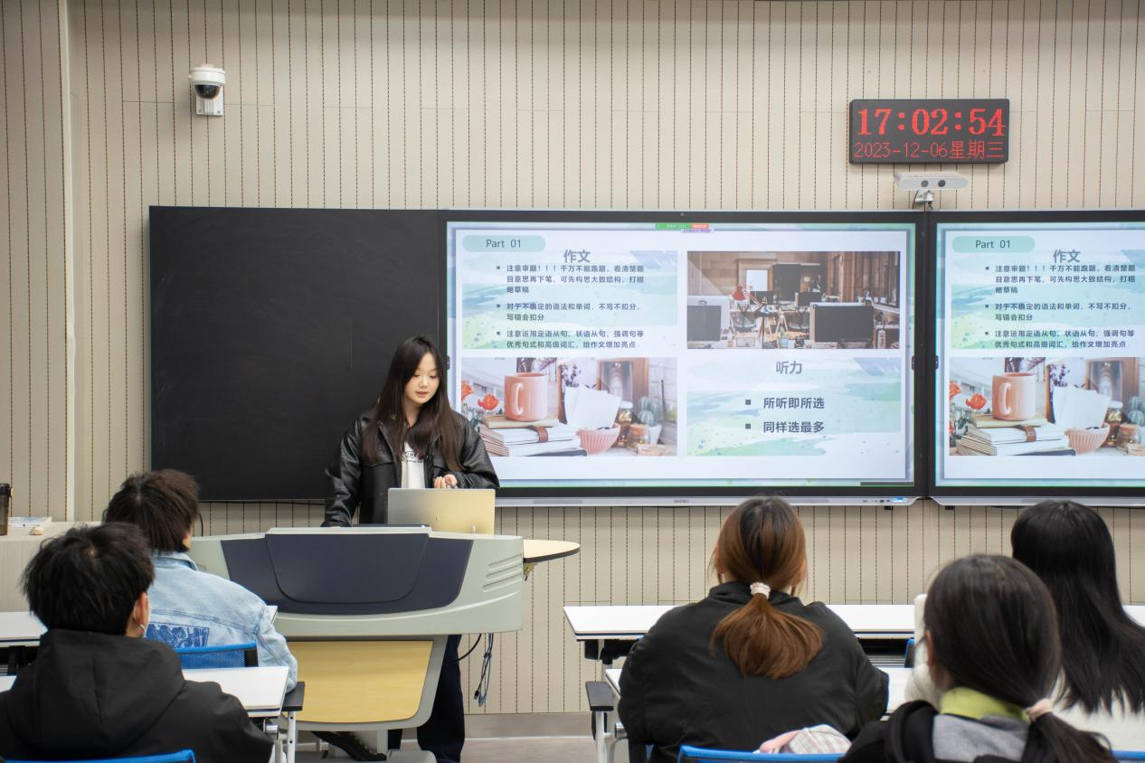 分享会中,郑璐结合切身备考经历围绕做题技巧、考前冲刺练习、考试时间安排、做题顺序等进行了分享与指导,分别从听力、阅读、写作和翻译等模块讲解,建议大家从听、说、读、写四个方面出发,坚持重复学习,不断积累,全面提高学习英语的能力。郑璐通过真题讲解,有针对性地指导大家演练做题技巧,并对大家的提问进行逐一解答。同时,她强调学习基础和学习兴趣的重要性,鼓励大家提高英语学习的积极性。