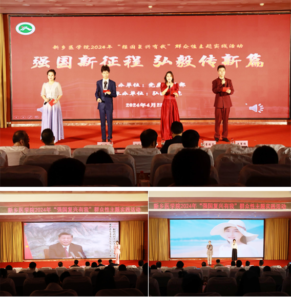 为深入学习宣传贯彻习近平新时代中国特色社会主义思想和习近平总书记视察河南重要讲话和重要指示精神,发挥群众性主题实践活动统一思想、凝聚力量的重要作用,庆祝新中国成立75周年,引导新时代新医人在抒发知党、爱党、颂党的真实情感中,汲取继续前进的智慧和力量,4月25日,由党委宣传部主办,弘毅书院承办的2024年“强国复兴有我”群众性主题实践活动决赛在博学楼第一报告厅举行。有关职能部门、学院、书院相关负责人,各单位师生代表500余人共同收听收看了这场盛宴。