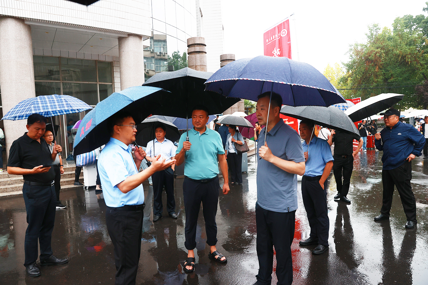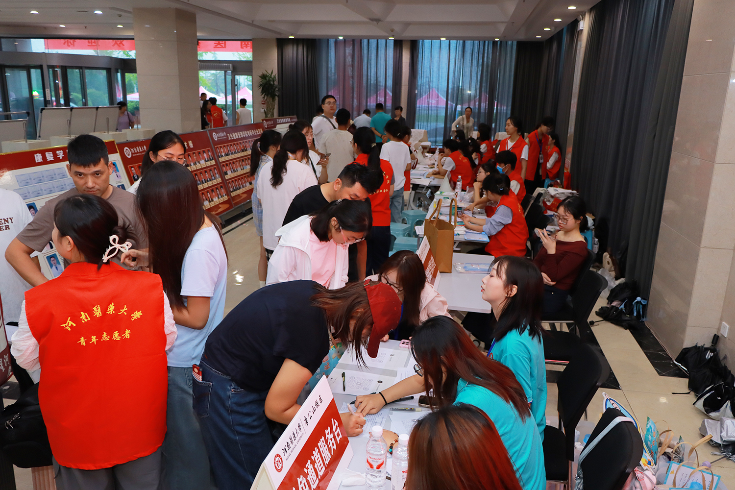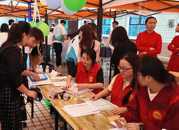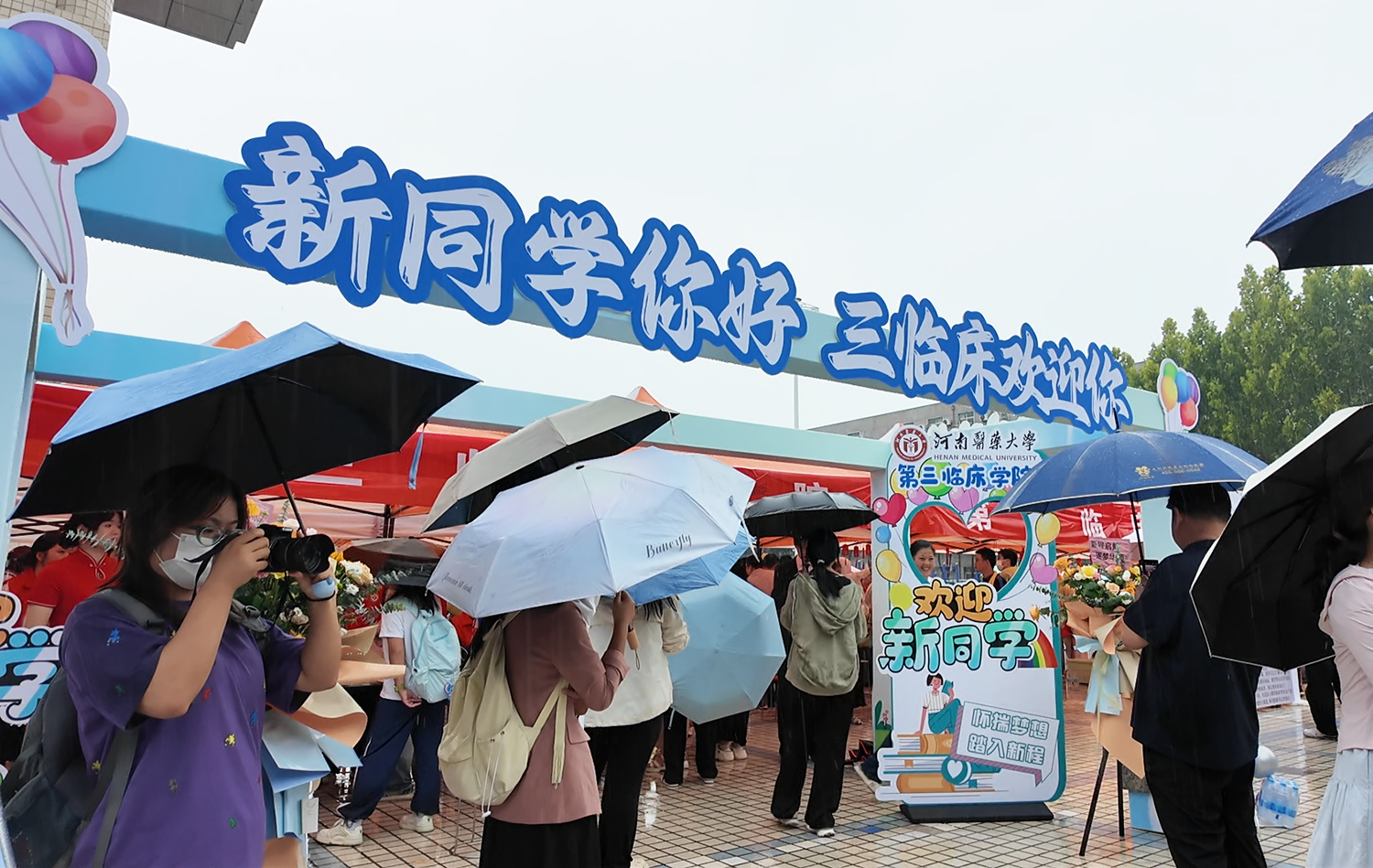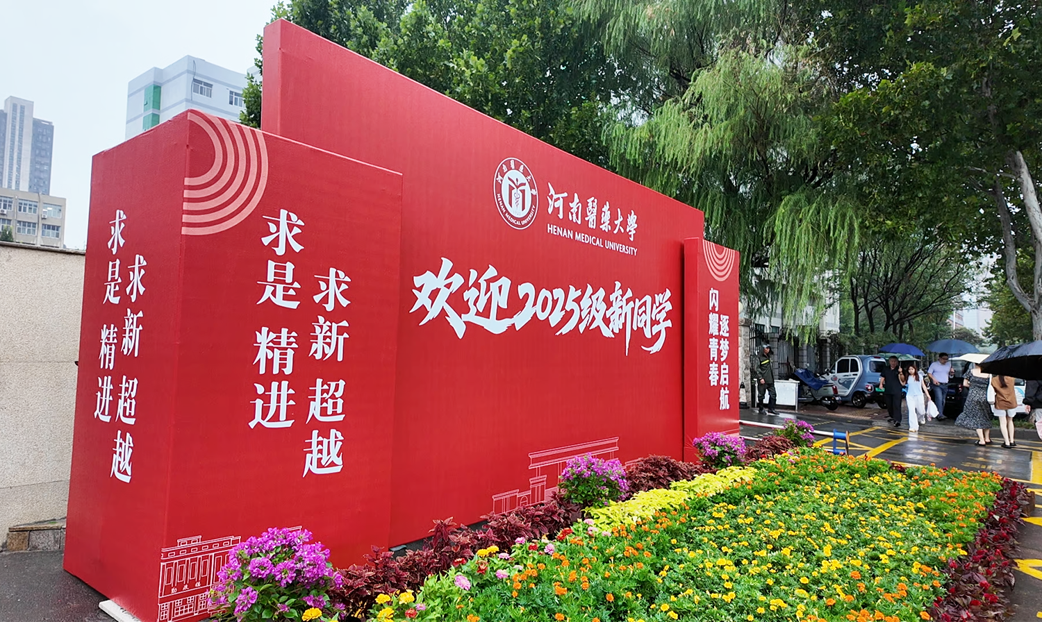 雨中的校园一派迎新的喜庆气氛:北大门外,设置“乘风起航 筑梦未来”巨幅欢迎背景板、红色气球和造型花坛;校园里,主干道铺设地贴,指引新生报到地点流程走向,开通四条彩旗通道,营造喜庆氛围;五环广场上,印有全体新生名字的打卡墙温情满溢,吸引新生雨中拍照打卡;大幅的报到流程和校区平面图展板、不间断播出的信息广播、发放到新生手中的迎新专刊,家长休息区提供床垫、被单、饮用水;各单位提前筹划,备好雨伞雨衣,现场分发给新生和家长;在火车站、高铁站分别设立迎新接待站,校园观光车在雨中不停往返,接送新生、运送行李;安保人员在各校区入口往返巡查、有序调度,为新生入校筑牢道路安全屏障。在各部门的通力合作下,迎新工作将热心、细心、耐心、关心和爱心贯穿始终,获得了新生和家长的一致好评。