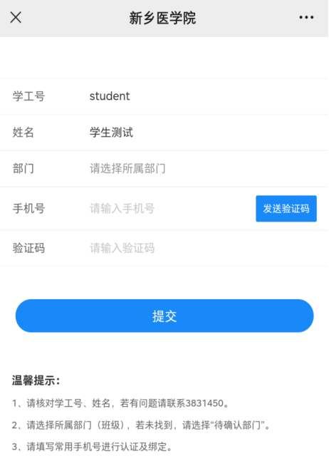 3.核对个人学工号,选择归属部门(班级),若未找到相应部门(班级),请选择“待确认部门”,并填写个人常用手机号并获取短信验证码,完成后点击“提交”即可。