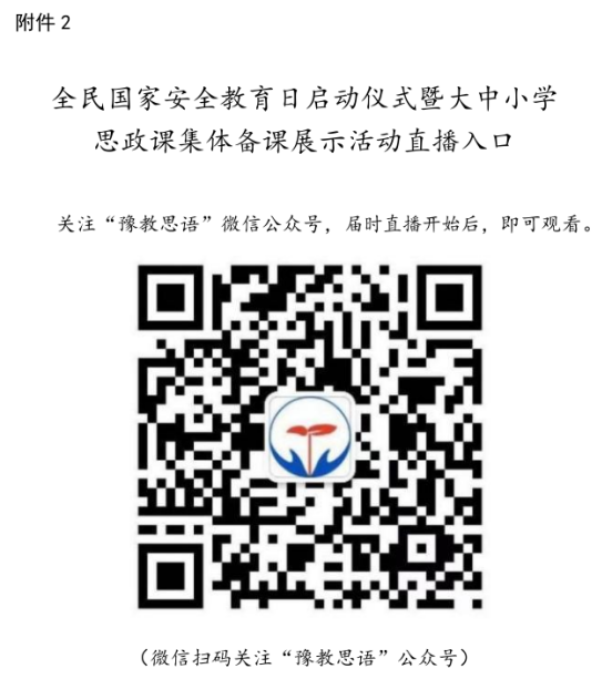 2.根据“中共河南省委教育工委办公室河南省教育厅办公室转发教育部思想政治工作司关于组织开展2023年全民国家安全教育日活动的通知”要求,组织学生4月15日上午9:00—11:30,省委教育工委省教育厅将在河南师范大学开展国家安全教育日启动仪式暨大中小学思政课集体备课展示活动,各学院组织师生可通过扫描二维码观看直播。