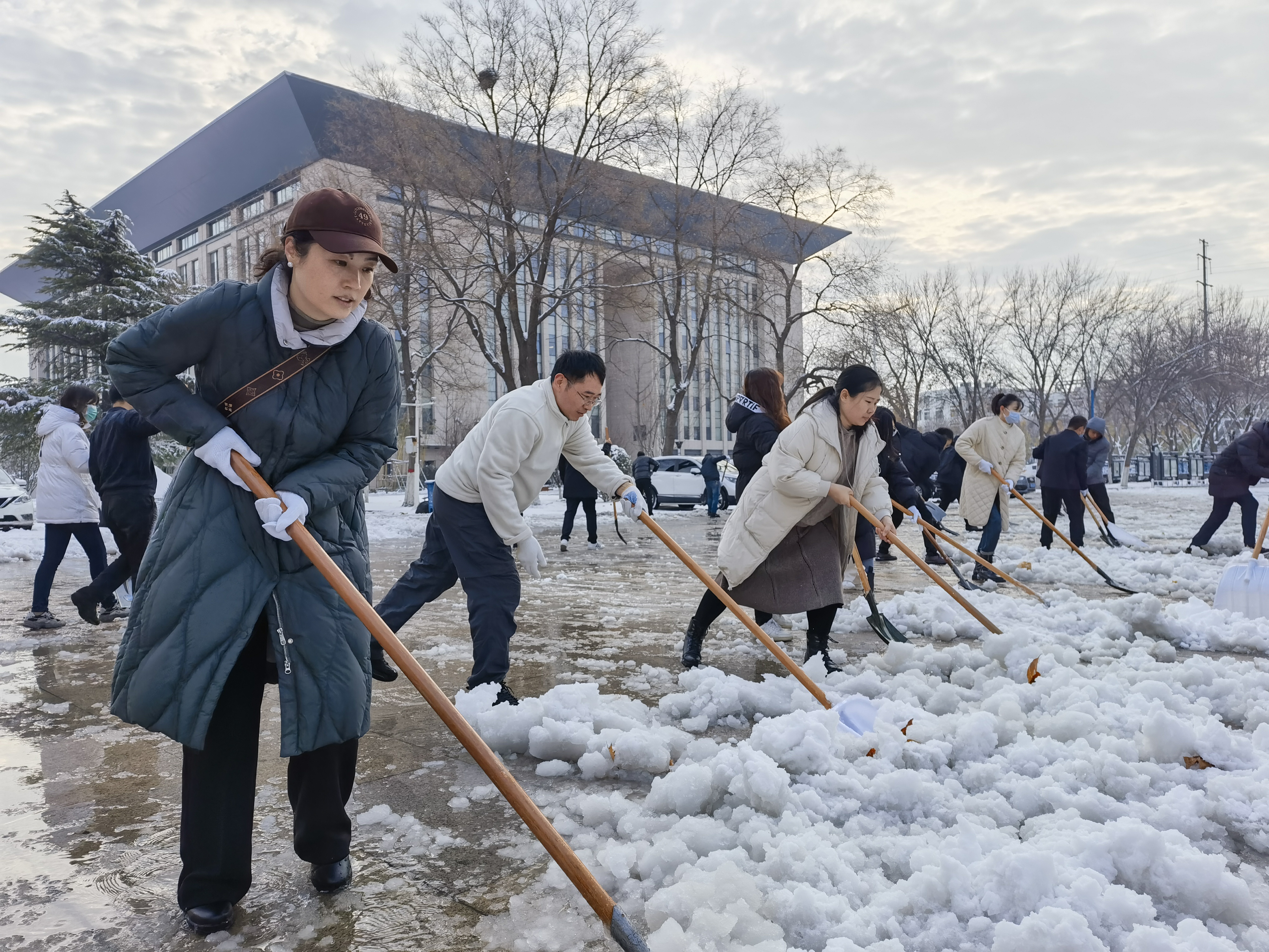 机关党委以雪为令,组织人员迅速投入扫雪除冰行动,合理安排工作,有效清雪除冰。大家不畏严寒、干劲十足,使用铁锹、扫帚、铲雪板等清理工具,分工有序、相互配合,全方位地开展扫雪除冰作业。经过大家的努力,一条条整洁的道路逐步清理出来,干净的勤政楼门口给师生带去方便、安全,大家用行动谱写着热火朝天的雪中情,守护着师生出行安全。(供稿:王彦瑞)