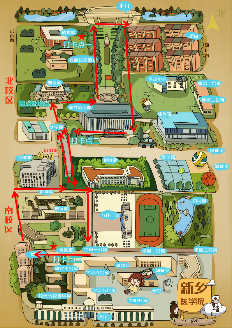 勤政楼前—鹏程路—科技楼(盖第一个印章)—博济路—旭升路—图书信息楼南门—向阳路天桥(盖第二个印章)—自强北路—务实楼—求真楼北门(盖第三个印章)—向阳路天桥—勤政楼前,全程约3.0公里。(路线图见附件一)。