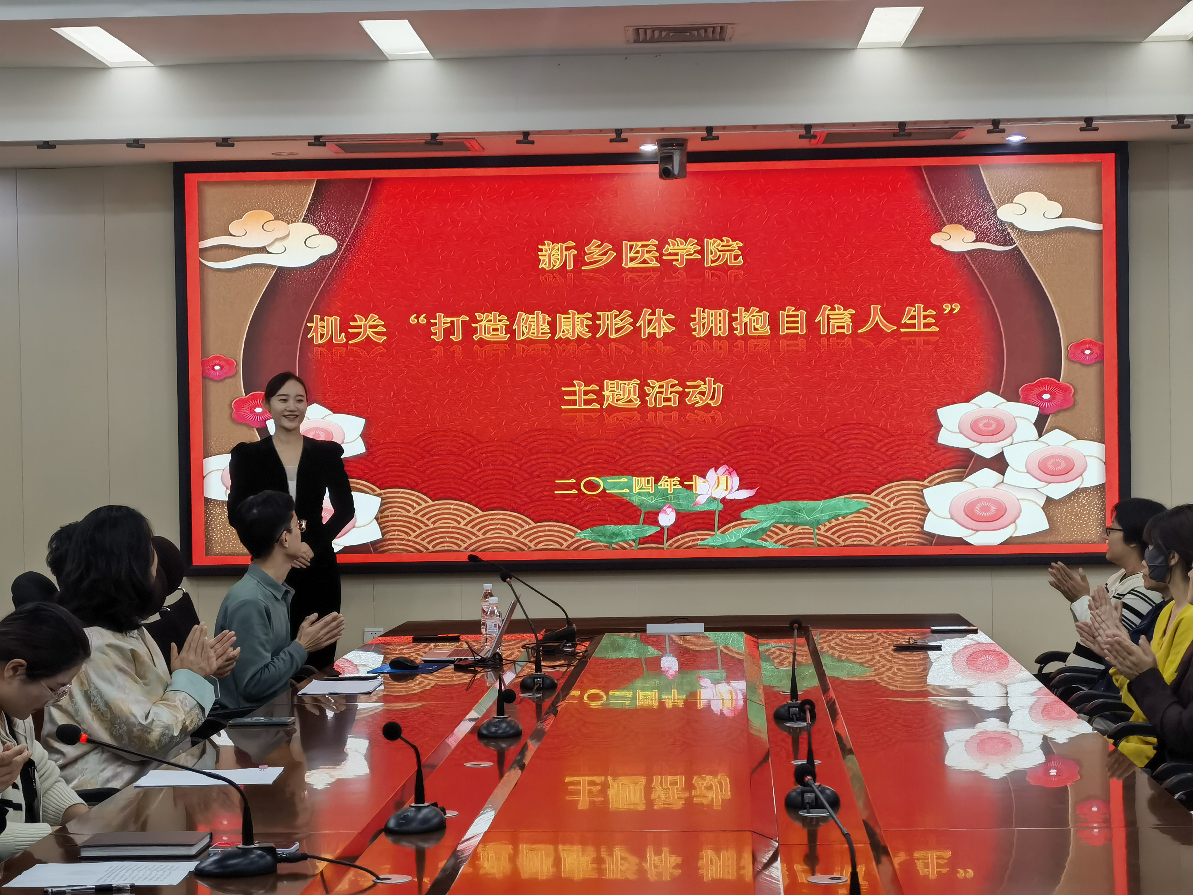 为深入贯彻党的二十届三中全会精神,积极落实健康优先发展战略,充分展现新时代高校干部职工的时代风采,树牢文明健康生活理念,不断提高机关干部职工的健康意识和形象气质,进一步丰富机关教职工的精神文化生活,10月17日下午,机关党委、工会于勤政楼六楼会议室举办“打造健康形体 拥抱自信人生”主题活动,由新乡市舞蹈家协会理事、中国舞和芭蕾形体教师、国家体态评估师与体态矫正师、形体礼仪教练柳志华女士主讲。机关党委副书记、工会主席雷好利主持。机关70余名教职工参加活动。