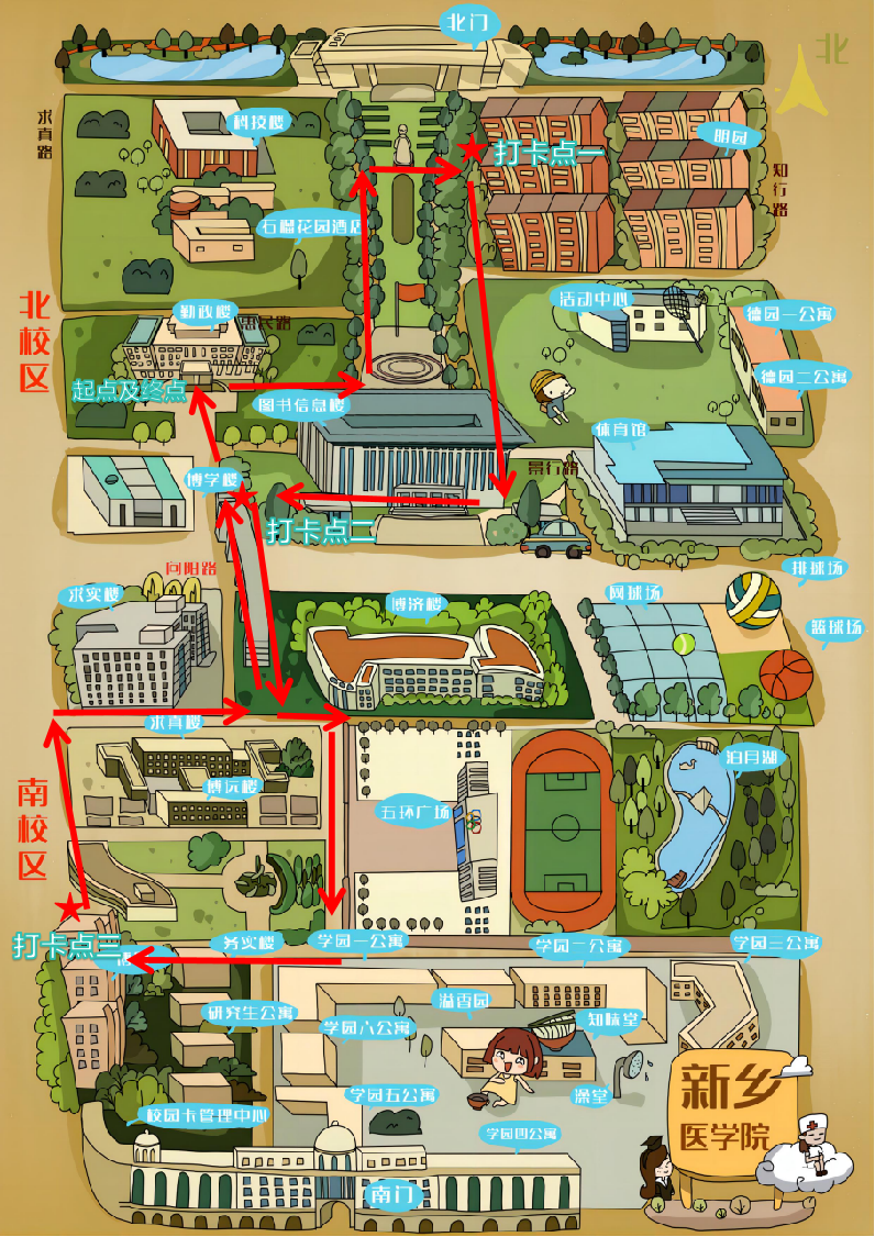 勤政楼前—鹏程路—科技楼—博济路桥东南角盖第一个印章—旭升路—图书信息楼南门—向阳路天桥盖第二个印章—自强北路—务实楼—校史馆(老图书馆)后侧盖第三个印章求真楼老实验楼北门—向阳路天桥—勤政楼前全程约3.0公里。(路线图见附件)。