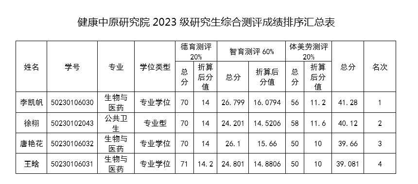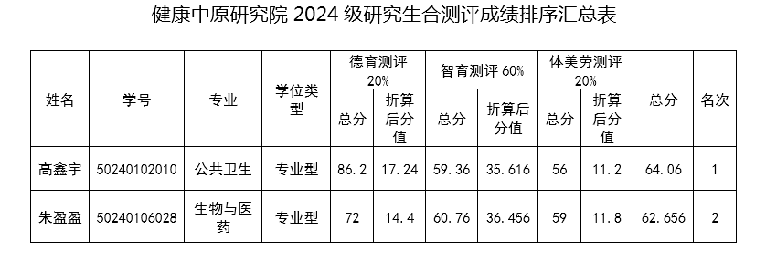 2025年健康中原研究院研究生学校奖学金评审综合测评排序公示