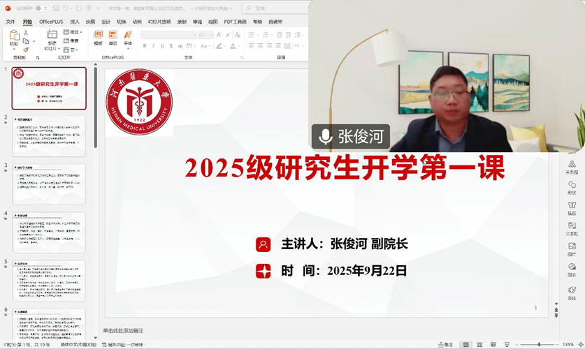 为帮助2025级研究生新生尽快融入新环境、锚定专业方向、涵养学术精神,近日,我院以“仁心砺术铸学魂,精诚致远启研程”为主题开展了新生入学教育活动。从思想引领到专业启蒙,从技能培养到成长规划,多样化的课程与实践活动层层递进,为新生们搭建起从“大学生”到“研究生”的过渡桥梁,助力其以昂扬姿态开启研究生新征程。本次活动由我院主管研究生工作的副院长张俊河主持并授课。