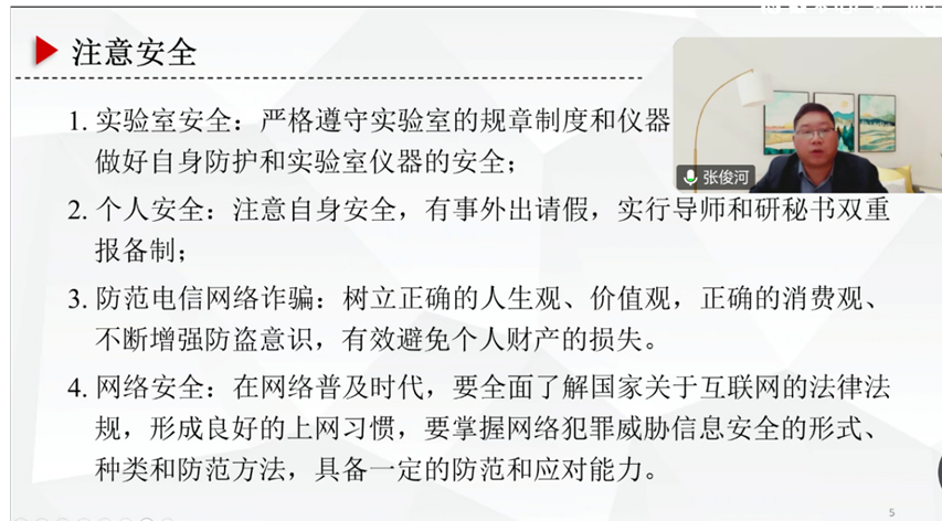 仁心”是我院人才培养的核心底色,既包含对专业领域的敬畏之心,也涵盖对社会、对他人的责任之心。在入学教育中,我们始终将思想引领与人文素养培育放在首位,帮助新生树立正确的价值观与成长观。张俊河围绕“研究生培养体系与学术规范”展开讲解,结合近年学术不端典型案例,明确论文写作、成果发表中的红线底线,强化新生学术诚信意识。以“砺术”为要,强化专业认知与能力储备,帮助新生清晰认识专业内涵、明确学习方向。以“精诚”为本,培育学术精神与协作意识,张俊河指出,“精诚”即精益求精的态度、真诚协作的精神,是学术研究与团队发展的关键品质,引导新生树立严谨的学术态度,培养团队协作能力。以“致远”为向,规划成长路径与发展未来,帮助新生明确未来发展方向,为实现人生目标做好规划。张俊河从职业发展、校园安全、实验室安全、网络安全、心理健康、生活适应等多方面入手,为新生提供全方位的指导。
