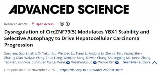 近日,我院教师郭学强博士在《Advanced Science》杂志发表题为“Dysregulation of CircZNF79(5) Modulates YBX1 Stability and Selective Autophagy to Drive Hepatocellular Carcinoma Progression”的研究论文,青年教师郭学强和郗玲玲为论文共同第一作者,我院任文杰教授、校特聘教授、广州医科大学郭伟圣教授和我校王磊教授为共同通讯作者,该研究得到了国家自然科学基金、河南省高校重点科研项目以及我校博士启动金、组织工程与再生临床医学中心开放课题等经费支持。