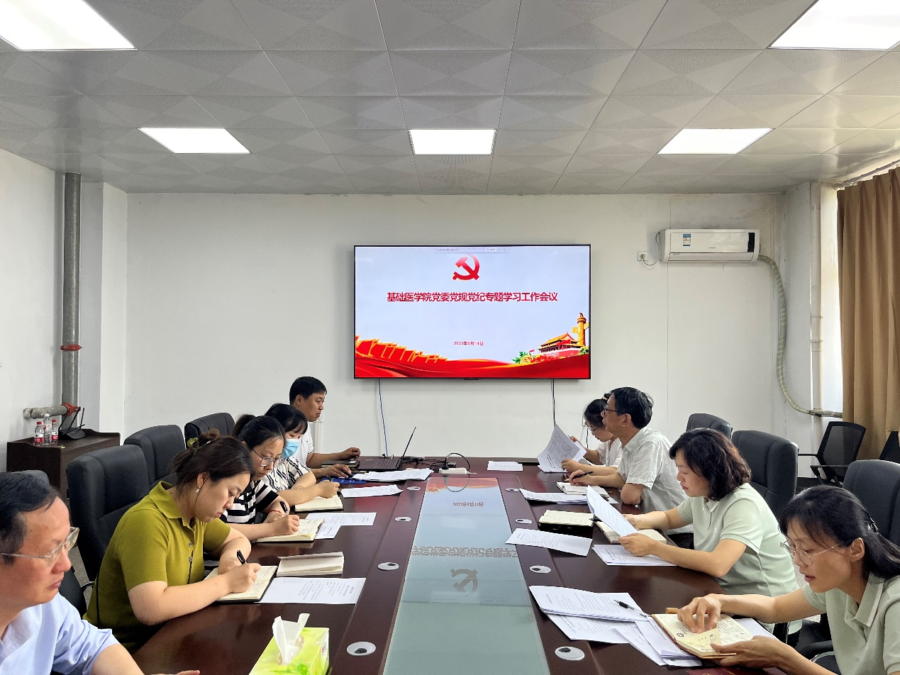 为深入贯彻落实党的二十大精神和习近平总书记关于严明党的纪律和规矩的重要论述,6月15日下午,基础医学院党委在求真楼东配楼331会议室召开学院党委党规党纪专题学习会,学院党政领导班子成员,各行政科室负责人、全体辅导员参加本次会议。