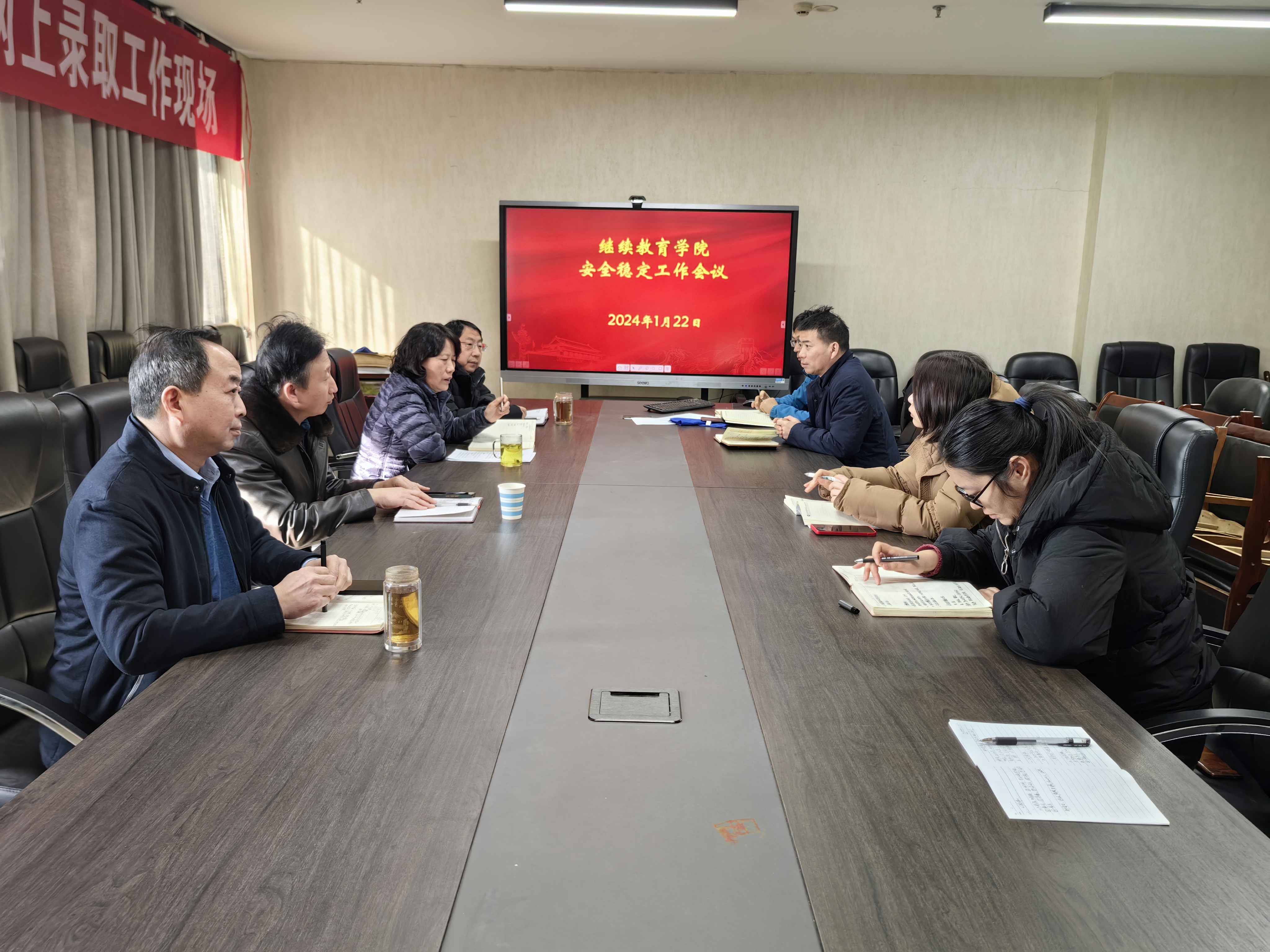 1月22日上午,继续教育学院在综合楼二楼会议室召开2024年度安全稳定工作会议。继续教育学院全体人员参加会议。