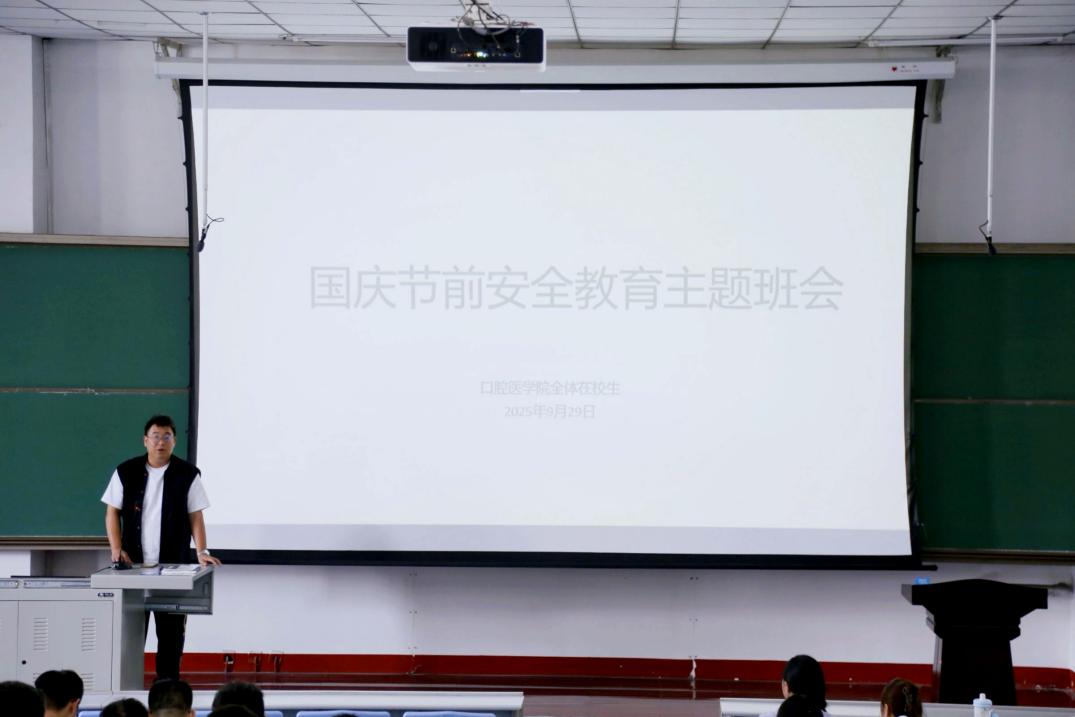 为进一步增强学生安全意识,确保全院学生度过一个平安、祥和的国庆假期,9月29日中午1时,口腔医学院于博学楼D2教室组织召开双节安全教育主题会。本次会议由我院学生工作办公室副主任张科峰主持,全院在校生参加。