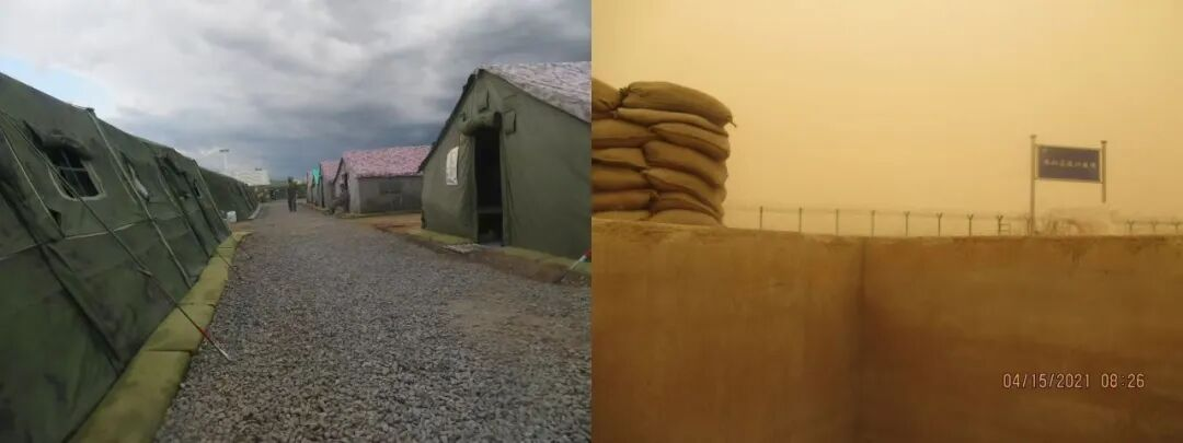 朱日和地处于内蒙古,那里四月份的天气变化无常,一天可以出现几种恶劣天气,同时在这种自然生态系统里,经常出现些野狼之类的牲口。踏进内蒙古,气温直线下降,在外面依稀能看到一些各样的牲口。大家都没了路上的兴奋,有甚者将野战雨衣裹起来御寒。我们在野外的住宿条件只有住帐篷,四五月份的狂风格外刺骨,吹的帐篷摇摇欲坠又往里面钻风,大家恨不得挤在一起取暖睡觉。虽然条件很苦,但没有人有任何怨言,因为来到这里,就是我们每个人的荣耀。