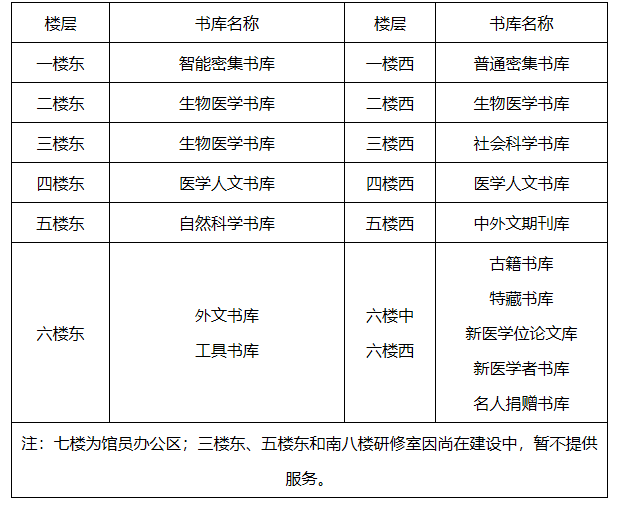 图书馆二楼东厅生物医学书库外侧、二楼西厅生物医学书库外侧、三楼东厅生物医学书库、三楼西厅社会科学书库、四楼东厅医学人文书库、四楼西厅医学人文书库、五楼西厅期刊库提供阅览、自习服务,三、四、五楼中厅及连廊、六楼西厅提供自习服务,其他书库、阅览室和自修室待书架和桌椅购置安装到位及电源和网络连通后逐步开放。