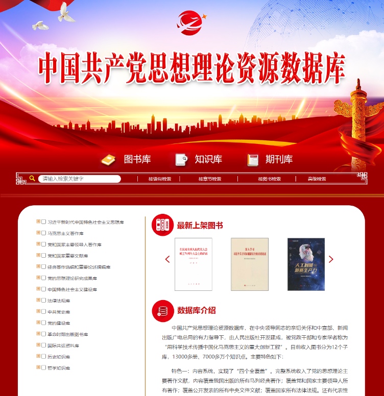 中国共产党思想理论资源数据库,收入图书分为14个子库,16000多册、7000多万个知识点。内容系统收入党的思想理论主要著作文献,覆盖我国出版的马列经典著作,覆盖党和国家主要领导人著作,覆盖公开发表的中央文件文献,覆盖国家法律法规。
