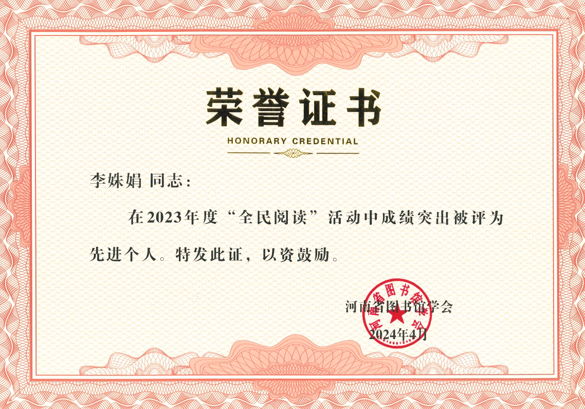 近日,河南省图书馆学会发布了《关于表彰2023年度“全民阅读”活动先进单位和先进个人的通知》,我校图书馆被评为2023年度“全民阅读”先进单位,李姝娟老师被评为“全民阅读”先进个人。