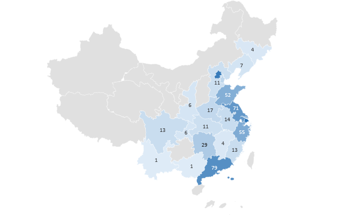 通过搜集、整理和分析本次高等教育博览会参展公司的地域分布,如图4所示,排名前三的省份和地区是:上海市(101个)、北京市(95个)、广东省(79个),其余公司也基本分布在我国东南地区,教育信息化和智慧教育产业的分布和我国的经济发展水平分布是相匹配的,通过参展公司的地域分布,可以从一定程度上推断出我国教育信息化存在着经济水平差距导致的东西部差距(图2)。