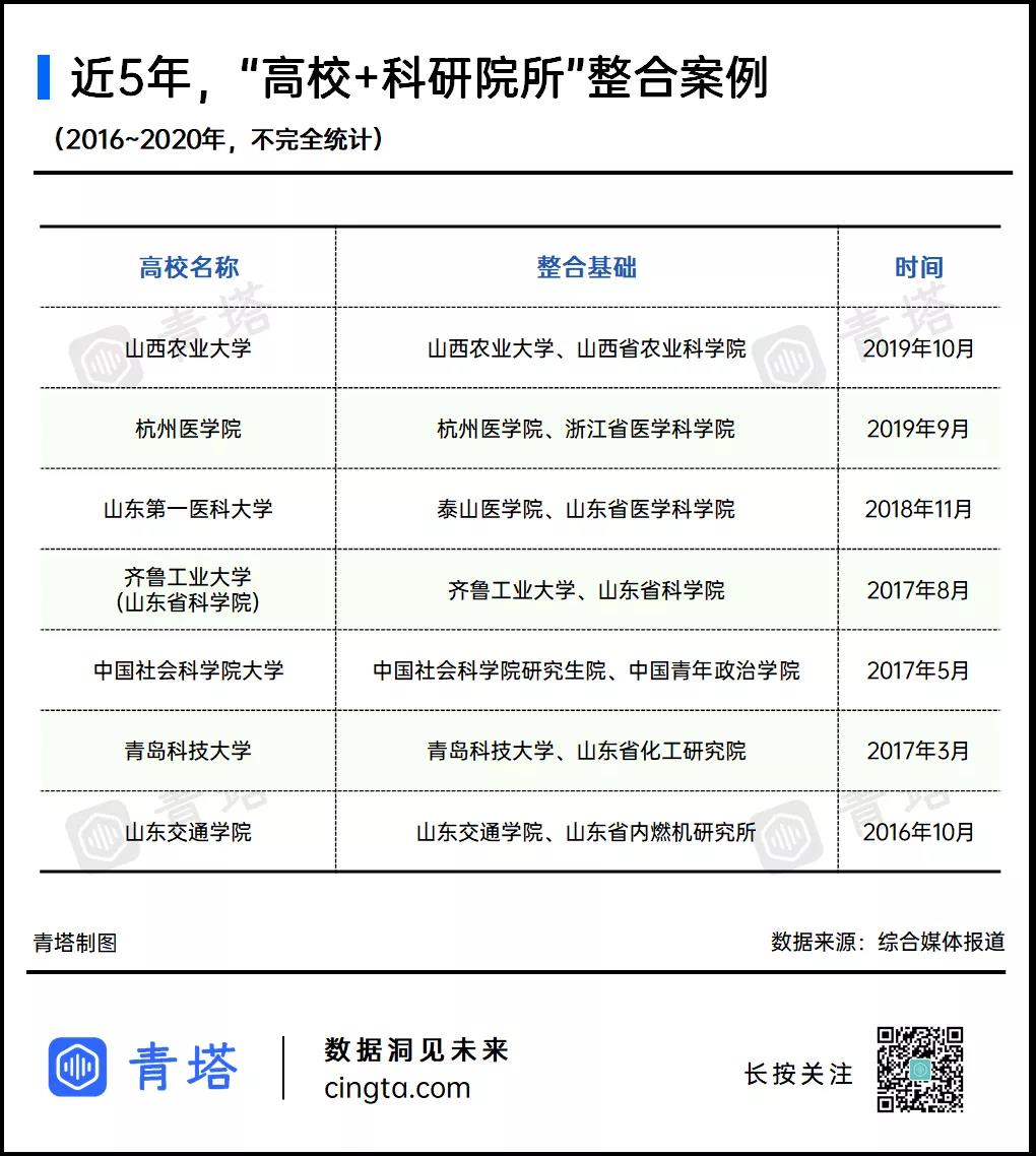 建校七十余年,作为一所实打实的老牌院校,却一直未能获批博士点,成为了不少齐鲁工大校友的“心头痛”,甚至只能用学校的“纳博士校园超市”聊以自嘲。如今一朝申博梦圆,背后离不开的是与山东科学院资源整合之后,学校综合实力全方位的迅猛发展。近年来,像齐鲁工业大学这样,由“高校+科研院所”合并而来的成功案例不在少数,从“共同培养”到“全面整合”,越来越多的科研院所,正在和大学走向“联姻”。▎高校+科研院所,造就一批“新大学”2016年4月份,山东省印发《关于推进高等教育综合改革的意见》,明确山东省将按照学科分类,整合省属科研院所和高校教育科研资源,集聚资源优势,形成发展合力,促进高水平大学建设。两个月后,作为试点单位,山东省内燃机研究所整建制并入山东交通学院,次年3月份,山东省化工研究院同样整建制并入青岛科技大学,两所学校的学科实力均得到了相当幅度的提升。在成功的试点之后,山东推进高校与科研院所资源整合的信心更加充分,改革力度也愈加大刀阔斧。