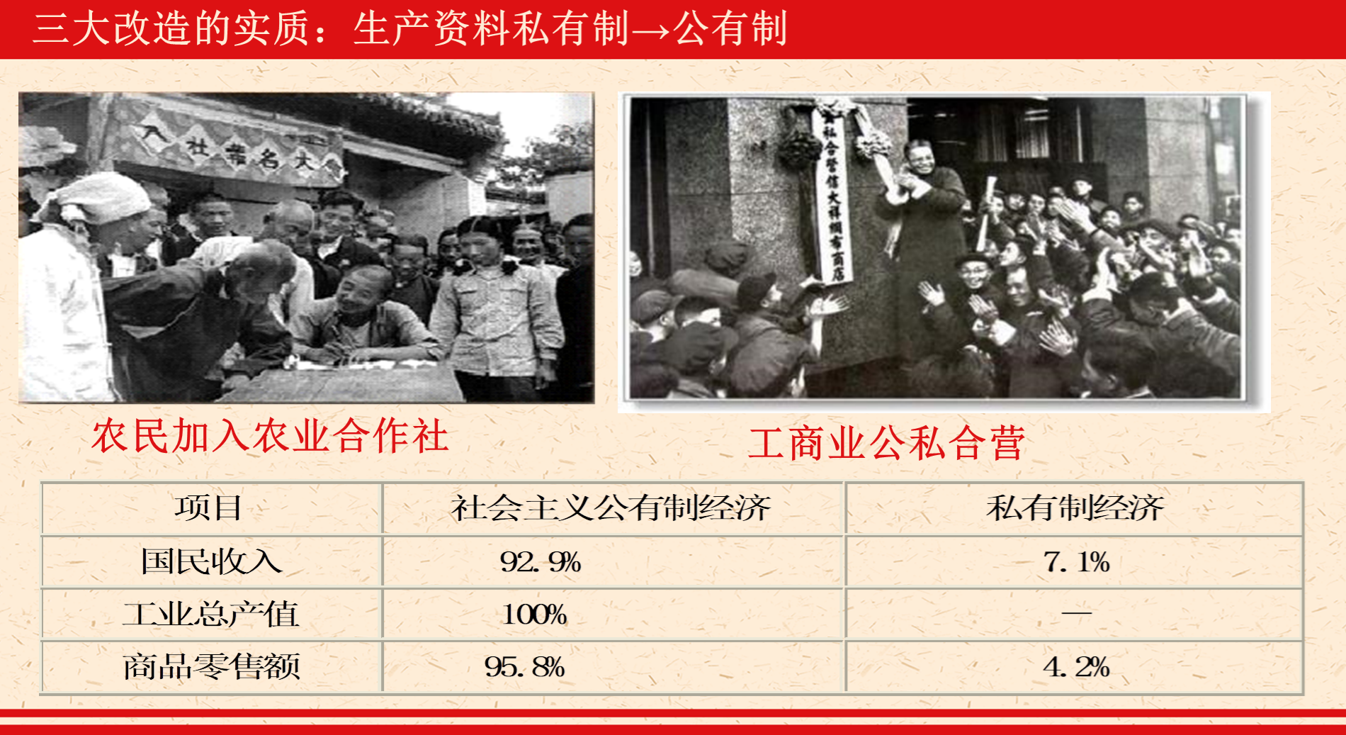 对资本主义工商业社会主义改造,形式:公私合营,政策:和平赎买。成果:实现了和平过渡。
