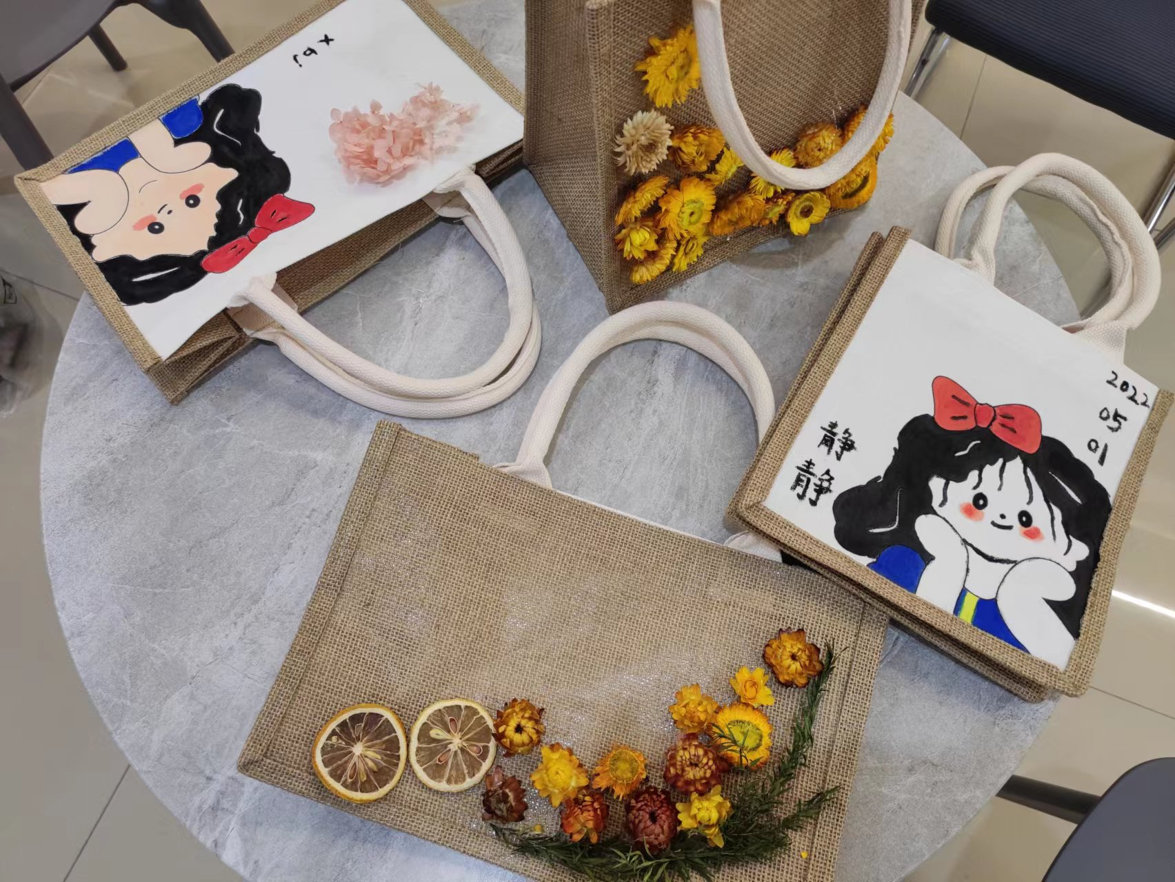课堂上,在主讲老师以及朋辈导师的引导下,同学们自由组队后从“画笔表达心情”——手绘帆布包、“留住时间的印记”——干花相框画以及“大画西油”——数字油画中选取自己感兴趣的手工项目进行自由创作。制作过程中,同学们纷纷突破了传统限制,将不同项目的材料予以组合,创造属于自己独一无二的手工艺品。