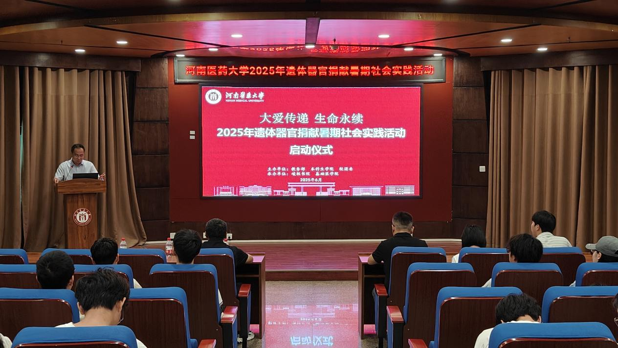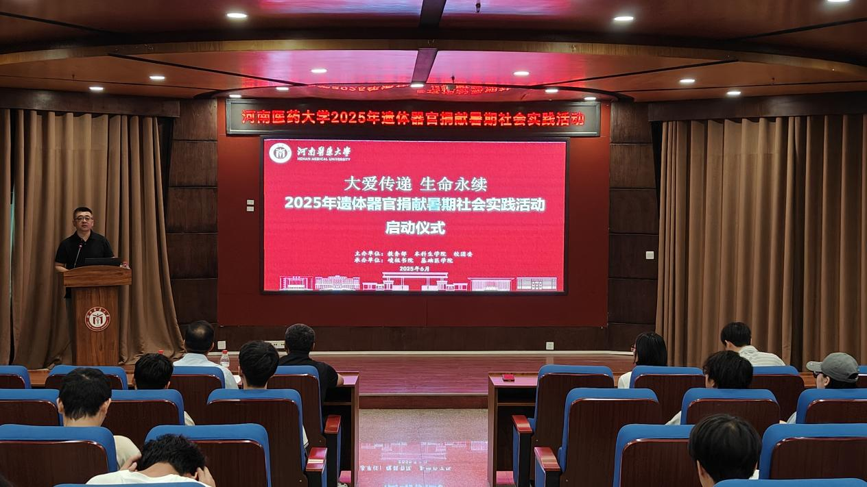 为贯彻落实健康中国战略与习近平总书记“人民至上、生命至上”的崇高理念,积极传播“人道、博爱、奉献”的红十字精神,鼓励青年学子在深入基层、深入社区的社会实践中长才干、增本领,6 月 27 日上午,河南医药大学 2025 年 “大爱传递 生命永续” 遗体器官捐献暑期社会实践活动启动仪式在学校第三报告厅顺利举行,来自全校 20 支队伍的负责老师及学生代表参加了启动仪式。