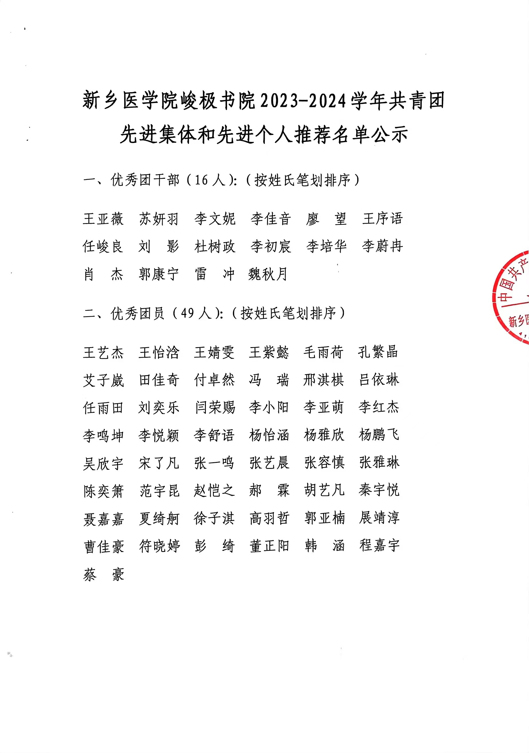 峻极书院2023-2024学年共青团先进集体和先进个人推荐名单公示