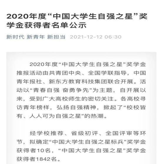 为提高学生的思想政治素质、学业成绩,培养学生品行端正、热心公益、乐观向上的精神。2020年度“中国大学生自强之星”奖学金颁发活动于今年12月份正式进行。在本届奖学金颁发活动中,我院王冰一同学荣获“中国大学生自强之星”奖学金。