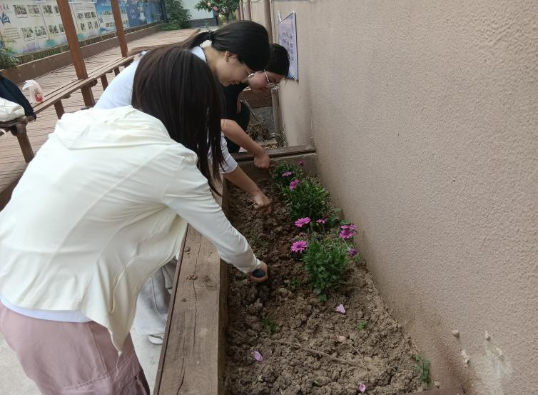 同学们热情高涨,分工协作。在花池清洁和除草环节,同学们分工明确、仔细清理,为后续种植做好准备。在花卉种植阶段,师生们按照种植规范的要求开展工作,挖坑、放苗、填土、浇水,确保每一株花苗都能茁壮成长。经过共同努力,文化长廊焕然一新,新栽种的花卉为校园增添了生机与色彩。未来一学年,参与师生将继续负责花卉的日常养护,确保绿植健康成长。