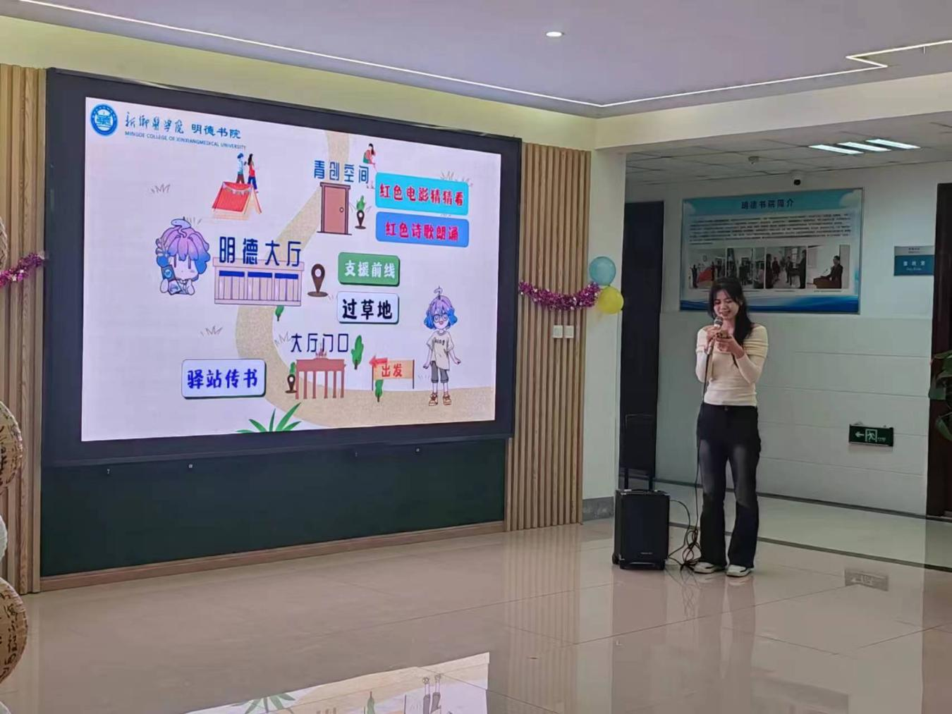 活动伊始,主持人在书院大厅进行开场白,随后为大家介绍活动背景和“驿站传书”、“支援前线”、“过草地”、“革命和英雄主义电影猜猜看”、“红色诗歌朗诵”五项红色文化游戏的游戏规则。同学们热情高涨,现场欢乐满盈。此外,为了让大家有充足的动力全身心投入游戏,感受到书院的关怀,规定集齐三颗五角星的同学即可兑换我院特意准备的“小明同学”同款笔记本及精美小礼物,让“小明同学”伴你走过红色十月,共度生日。