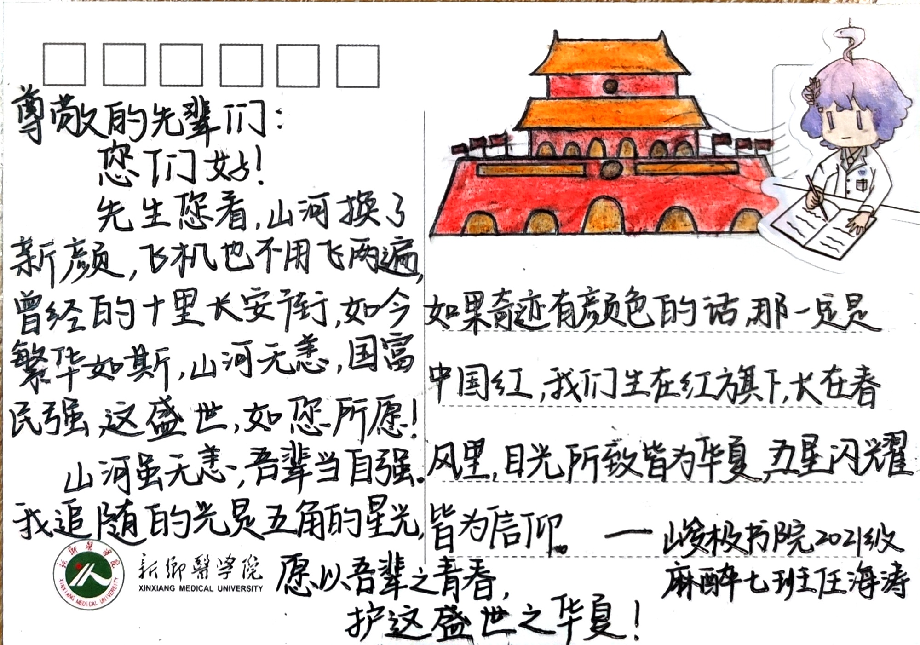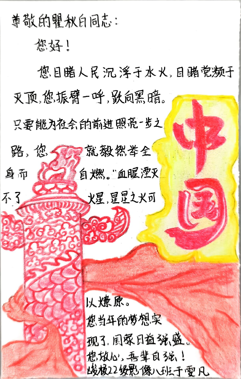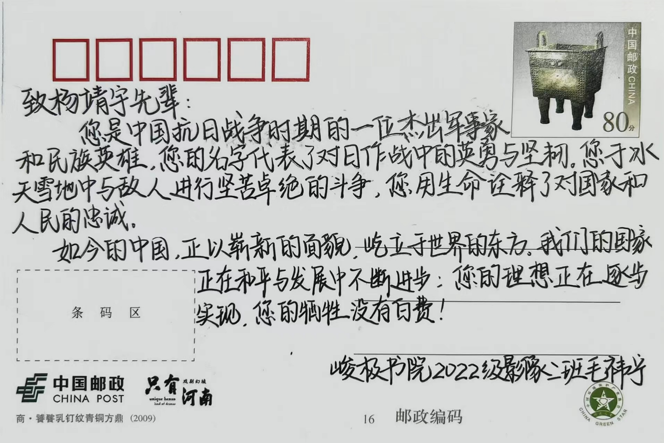 同学们以“超时空对话,先辈我想对您说”为主题,让同学们用心诉说一段段深切的思念,在一张张明信片上写下了满怀的热忱,字里行间饱含着对先辈们的崇敬之心。以这种独特的方式,让红色血脉得以赓续,让红色精神不断发扬。