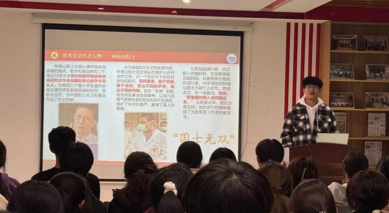 梁峰首先向同学们讲述了一些优秀党员前辈的模范事迹。钟南山院士敢医敢言、 勇于担当,提出的防控策略和防治措施挽救了无数生命,以实际行动诠释了“人民至上、生命至上”的使命担当;李兰娟院士受国所托,逆行武汉考察疫情,果敢提出“武汉必须封城”的建议,其行为就是“人民高于一切, 生命重于泰山”的生动注解。