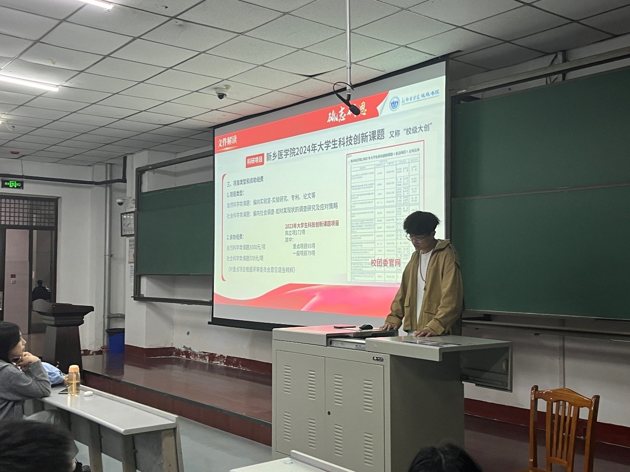 为帮助学生更好地理解和掌握科技创新课题的立项流程与方法,进一步激发书院学子的科研热情和创新能力,我院于10月14日晚上19:30在博学楼3101教室开展2024年大学生科技创新课题申报培训会。此次活动邀请了22级麻醉专业梁峰同学担任主讲嘉宾,他以其丰富的参赛经验和卓越的科研成果,为同学们带来了一场精彩的讲座。