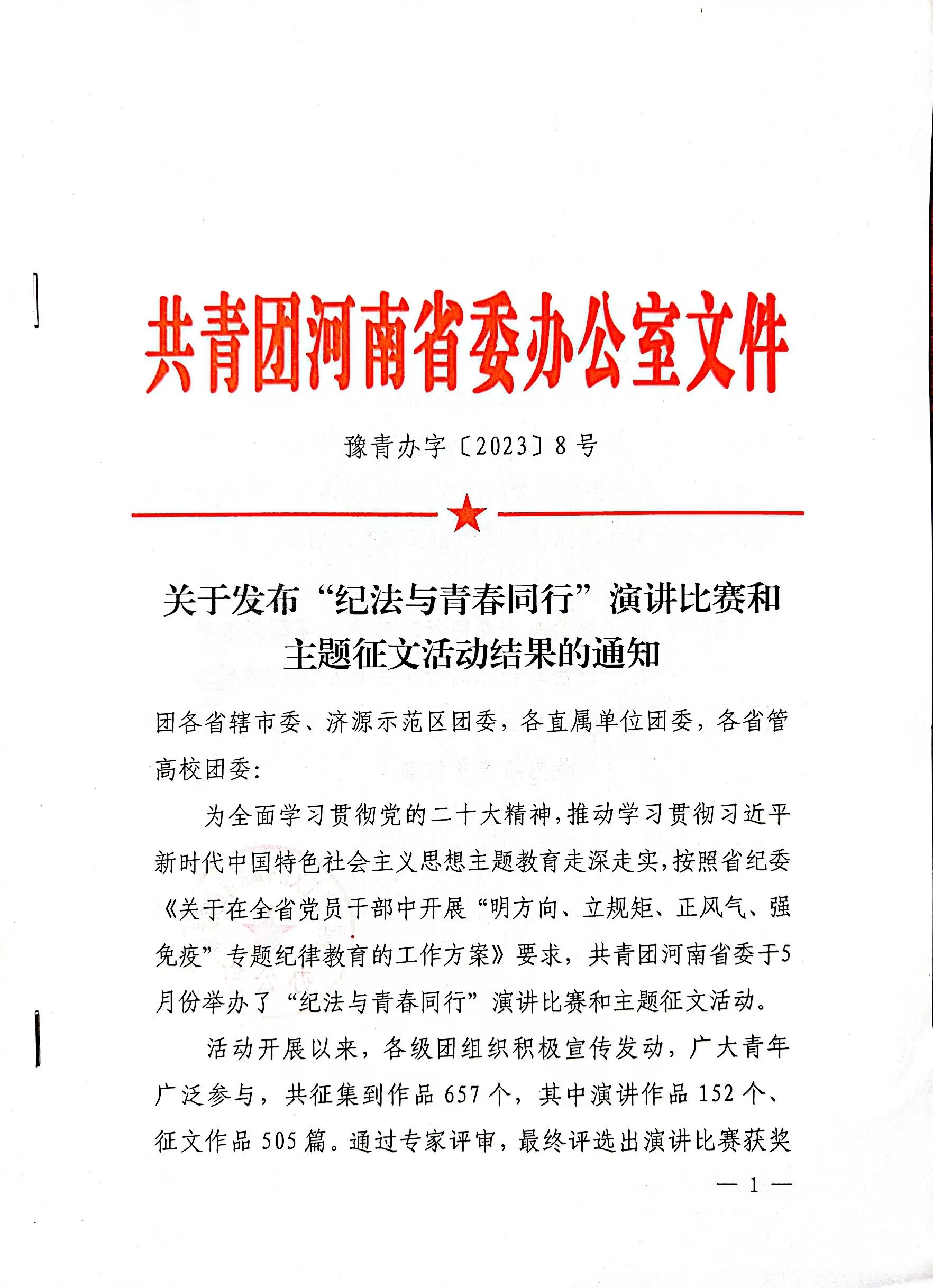为全面学习贯彻党的二十大精神,推动学习贯彻习近平新时代中国特色社会主义思想主题教育走深走实,近期,团省委组织开展“纪法与青春同行”主题征文活动。我院学生曹卓凡的作品荣获三等奖。