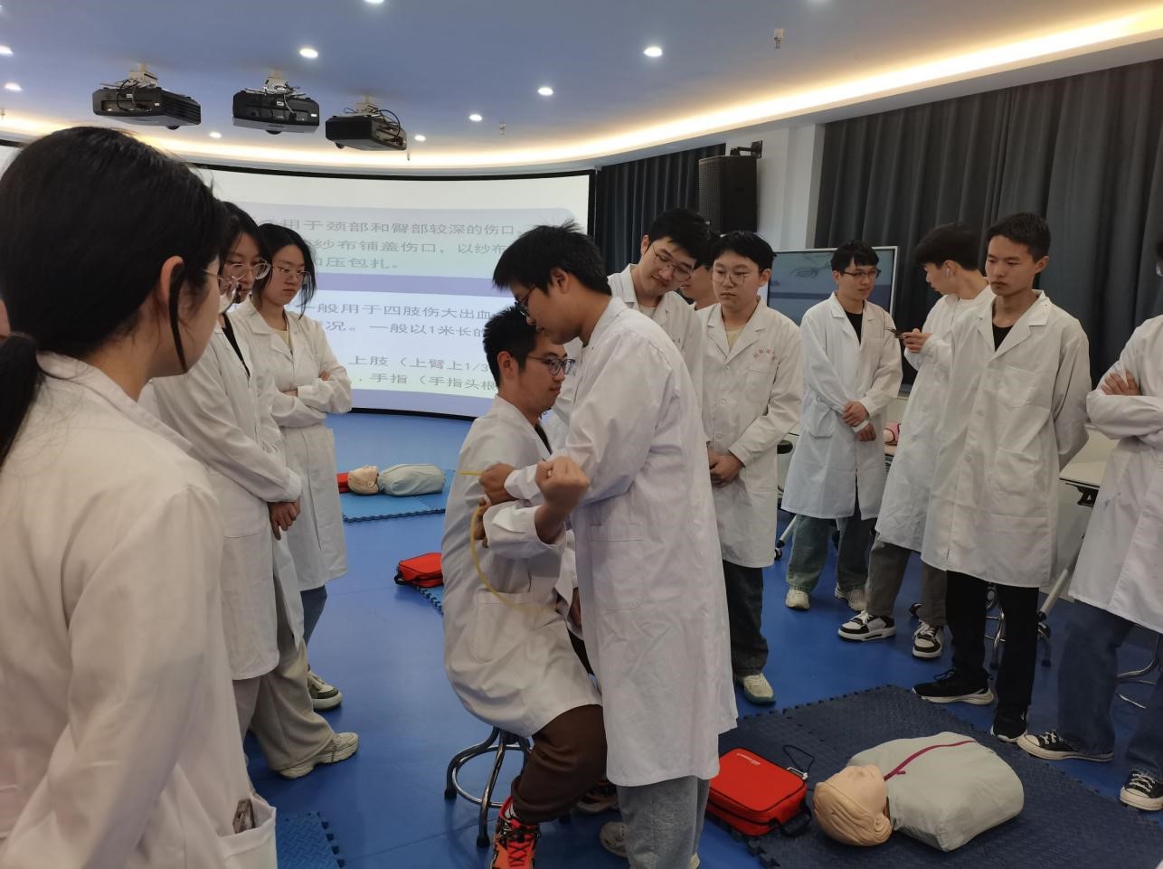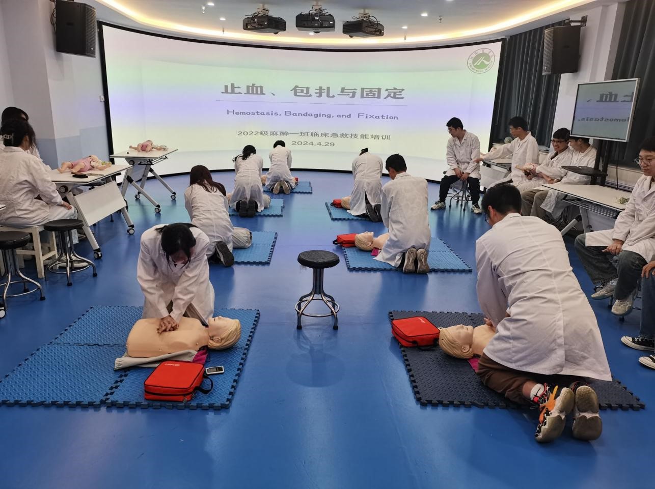 为加强同学们的急救知识素养,提高同学们应对突发情况的紧急救护能力。4月29日我院2022级麻醉一班特邀临床技能培训中心贺玉娟和张红云老师开展“止血包扎与固定”临床急救技能培训,本次活动由班级班委主动策划组织,同学们积极响应,展现出极大的学习热情。
