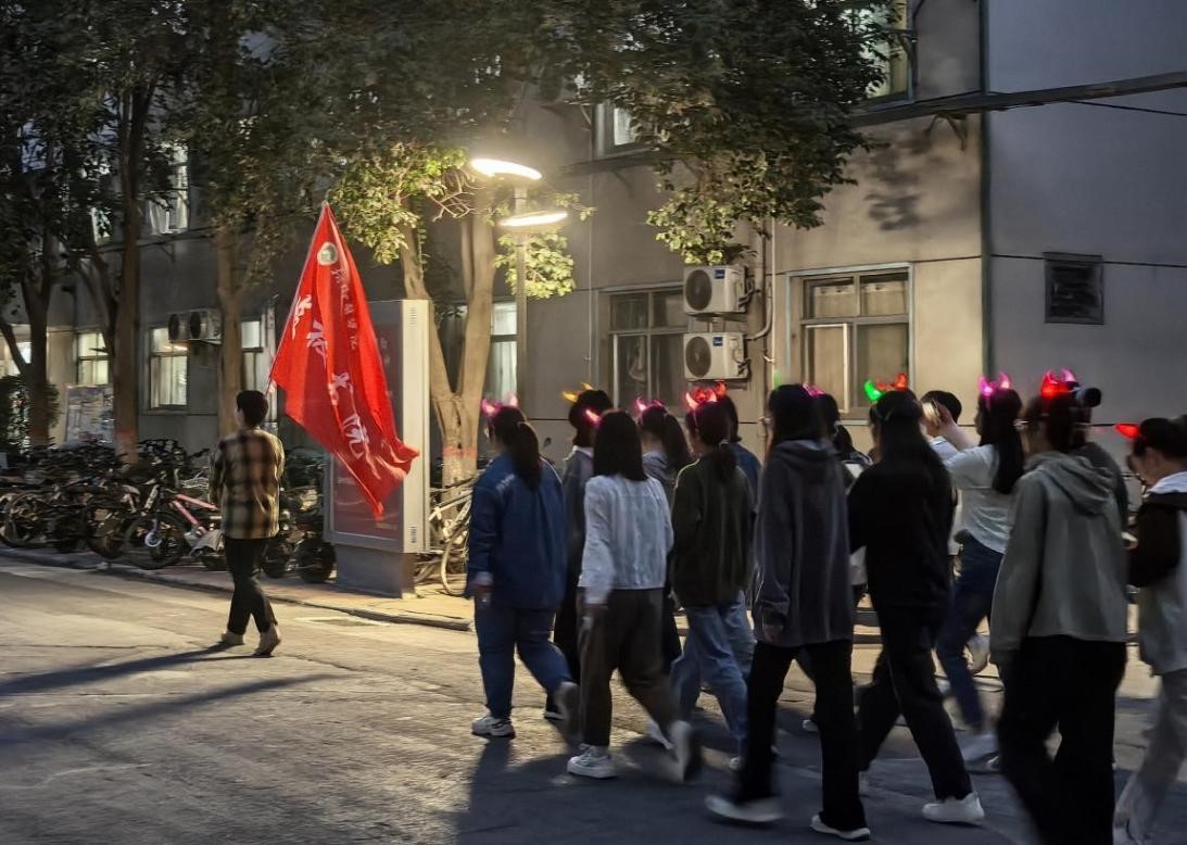 在五环广场进行集体动员后,同学们开始了荧光夜跑的第一个环节——集体跑,在书院旗帜的引领下,大家步伐一致,热情高涨,神采飞扬,犹如一道流动的彩虹。集体热身后,同学们来到北校区参与分散跑比赛,分散跑环节共设置六个游戏点和一个中心点,同学们可以自由选择夜跑路线。在集齐3-6枚印章后,即可向中心点发起冲刺。各小组在活动中遵守规则,通力合作,寻找适合本组的路线,激情奔跑,挥洒汗水,充满着欢声和笑语。点点荧光汇聚成校园里的星河漫漫。