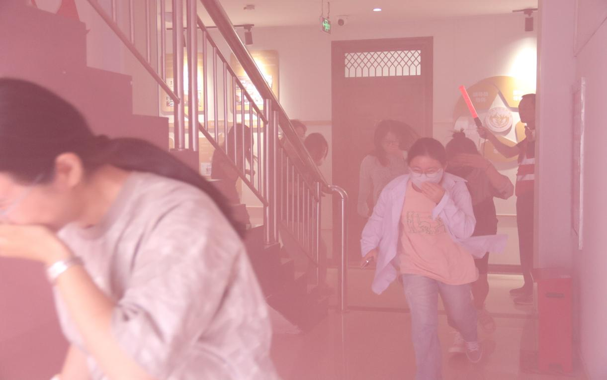 理论培训结束后,随即开展应急疏散演练。在消防管理中心老师们精心布置现场后,随着一阵急促的警报声响起,疏散演练正式开始。全体师生按照预先制定的应急疏散方案,捂住口鼻,弯腰低姿,沿着指定疏散路线,迅速、有序地撤离至书院前安全区域。从警报响起到全体师生安全集合完毕,仅用时3分钟,整个过程紧张有序,达到了预期效果。