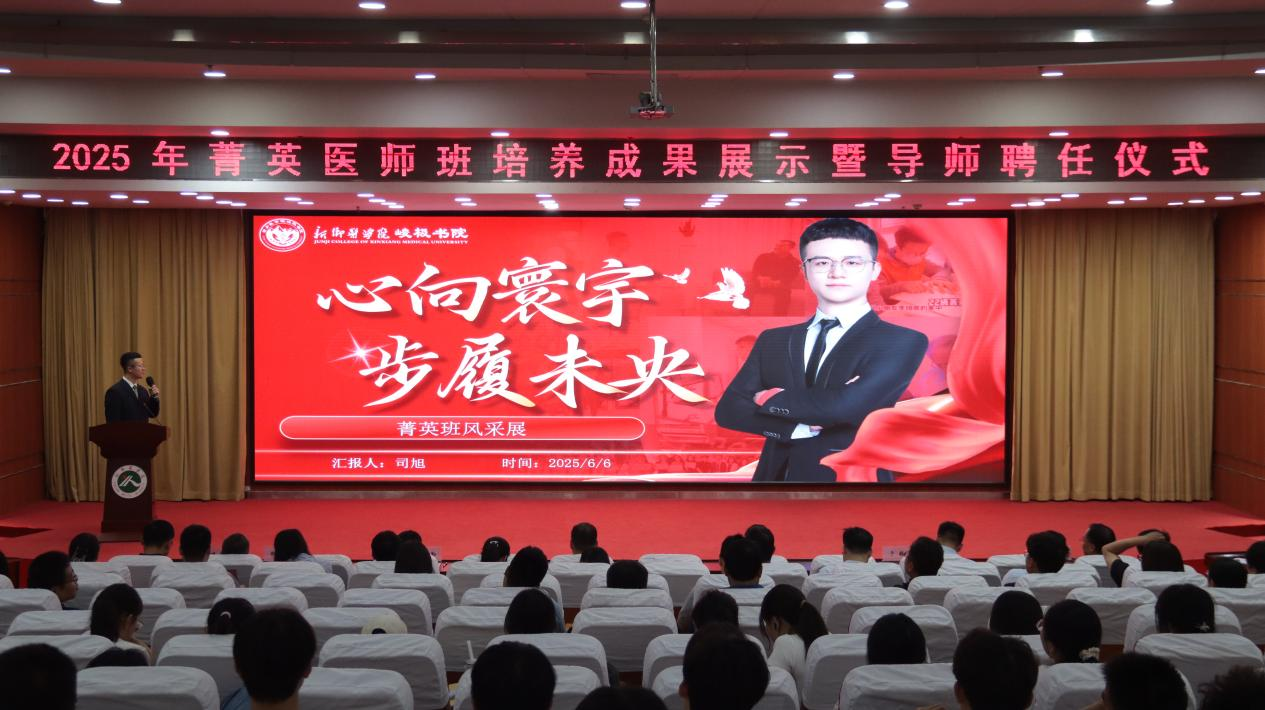 为进一步深化我校新时代拔尖创新人才培养体系,推进菁英医师教育反哺教育教学改革,6月6日晚7点,我校于第一报告厅隆重举办2025年菁英医师班培养成果展示暨导师聘任仪式。校党委委员、副校长林俊堂出席仪式,教务部、本科生学院、科技发展部、峻极书院等部门负责人,菁英医师班导师、班主任、辅导员及全体同学近200人参加仪式,仪式由峻极书院党委书记、院长邱永建主持。