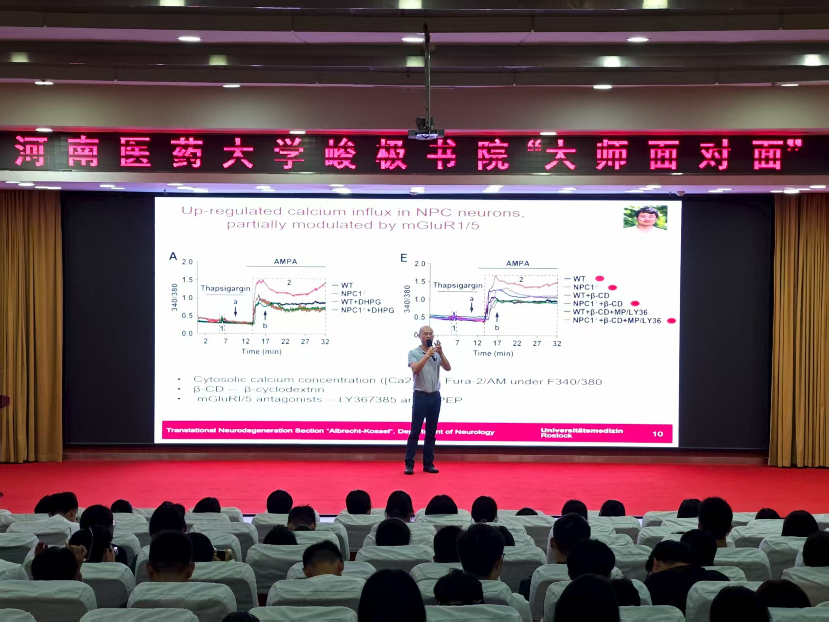 2025年9月8日,峻极书院菁英医师班全体同学齐聚一堂,在河南医药大学第一报告厅开展了“大师面对面”活动,共同聆听德国学者Jiankai Luo带来的关于“NPC1在神经发育及神经退行性疾病中的作用”的讲座,为新学年的学术探索拉开了精彩的序幕。
