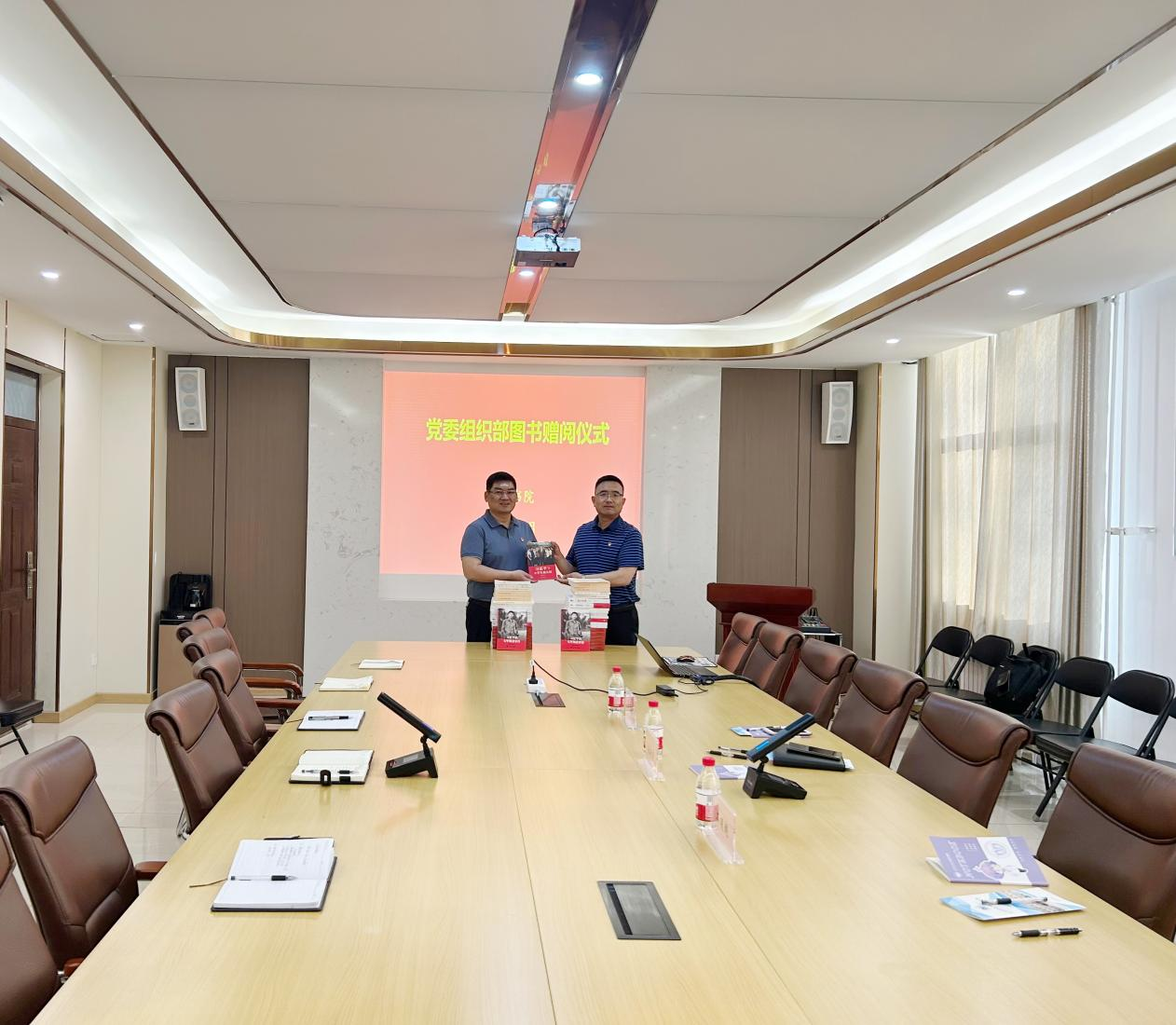 捐赠仪式在书院会议室进行,崔新宇代表党委组织部甄选党的创新理论、伟人自传等书籍赠与书院,助力书院文化建设。