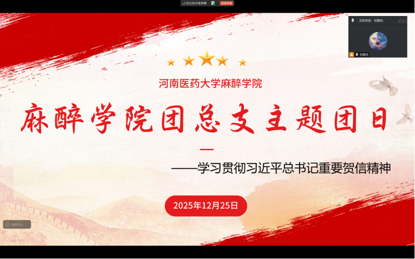 为深入学习宣传贯彻习近平总书记致中国志愿服务联合会第三届会员代表大会重要贺信精神,切实筑牢青年学子的思想根基,12月25日至26日,河南医药大学麻醉学院团总支以主题团日活动为抓手,结合不同年级学情特点,采用2021级线上互动学习,2022、2023级线下集中研学的分阶模式,组织全体学生开展专题学习,推动贺信精神在青年群体中落地生根。