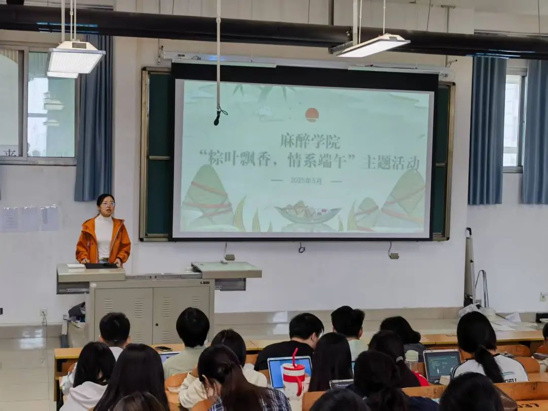 为弘扬中华传统文化,增进师生情谊,5月23日,麻醉学院于卫辉校区教学楼1206教室举办"粽叶飘香,情系端午"主题活动。麻醉学院党支部副书记王琰、辅导员刘慧仿出席活动。在粽香中共话端午习俗,感受传统文化魅力。
