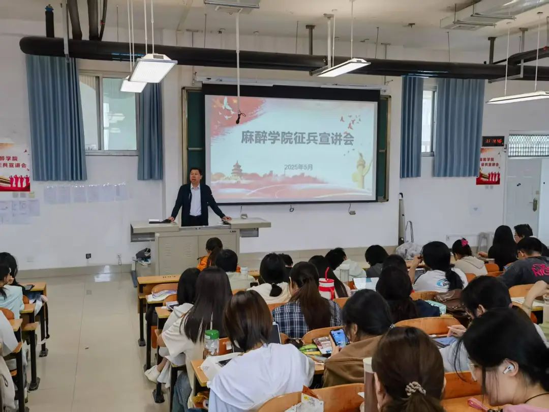 为深入贯彻新时代强军目标,激发青年学子参军报国热情,麻醉学院于5月23日在卫辉校区1206教室召开了麻醉学院征兵宣讲会。麻醉学院党总支部副书记王琰、辅导员刘慧仿及2021级麻醉专业全体学生参加此次大会。