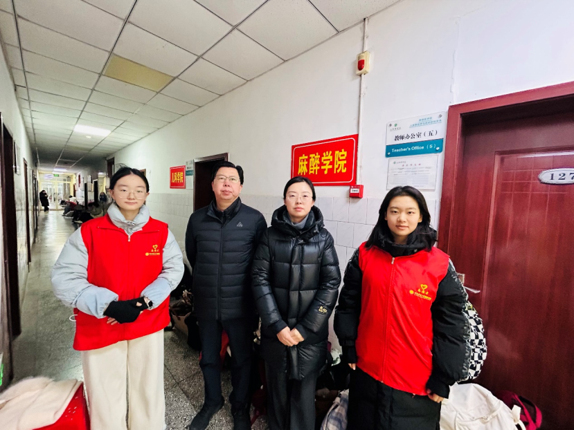在两校区醒目的“麻醉学院”物品放置区,身披红色志愿马甲的志愿者们分工明确、有条不紊,细心为学子整理、保管随身行囊。与此同时,王琰副书记与刘慧仿辅导员深入服务现场,与即将奔赴考场的学子亲切攀谈,关切询问他们的应考准备与心理状态,用暖心话语送上真挚祝福与加油鼓劲,让学子们在寒冬中感受到学院带来的浓浓暖意与坚实力量。