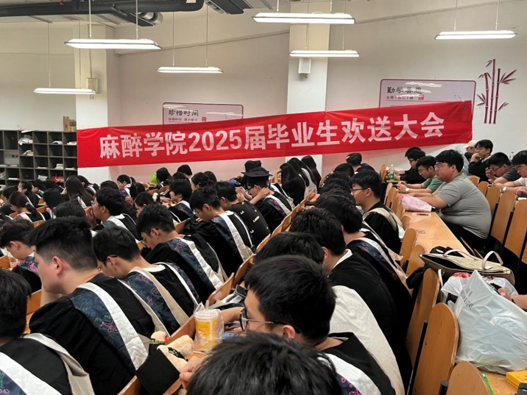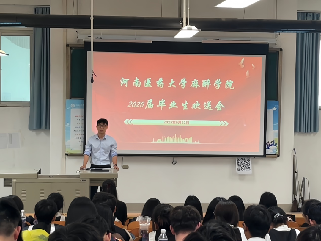为了加深本科毕业生与母校间的情感纽带,强化本科毕业生从医学生向研究生、规培生等身份的转变,2025年6月21日上午九时,麻醉学院于1206教室举行河南医药大学麻醉学院2025届毕业生欢送会。本次活动由麻醉学院学工办副主任何昊主持,麻醉学院党总支副书记王琰,麻醉学院办公室王含章老师受邀出席,2025届麻醉学专业全体毕业生参加本次欢送会。