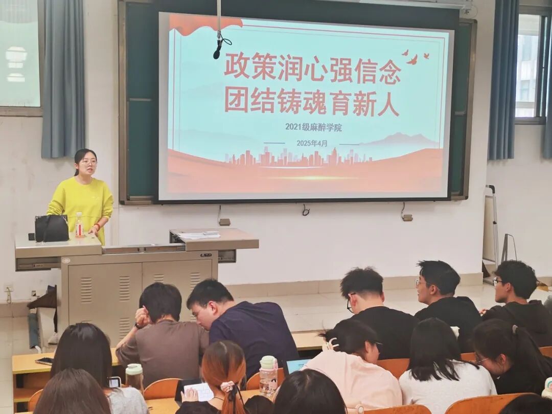 为坚定理想信念,凝聚民族力量,4月16日下午麻醉学院在卫辉校区1206教室开展“政策润心强信念,团结铸魂育新人”主题讲座。2021级全体麻醉学生出席讲座。