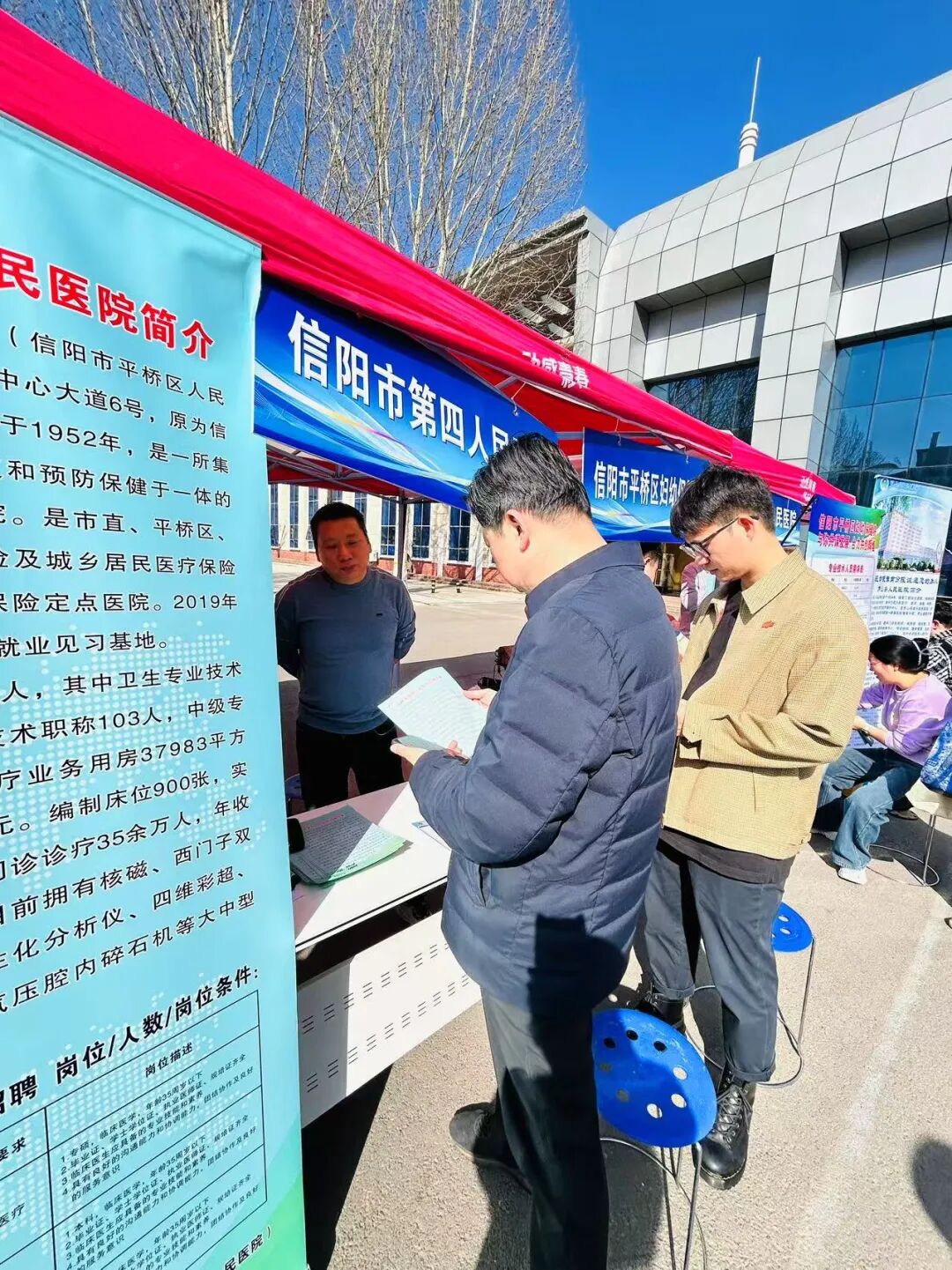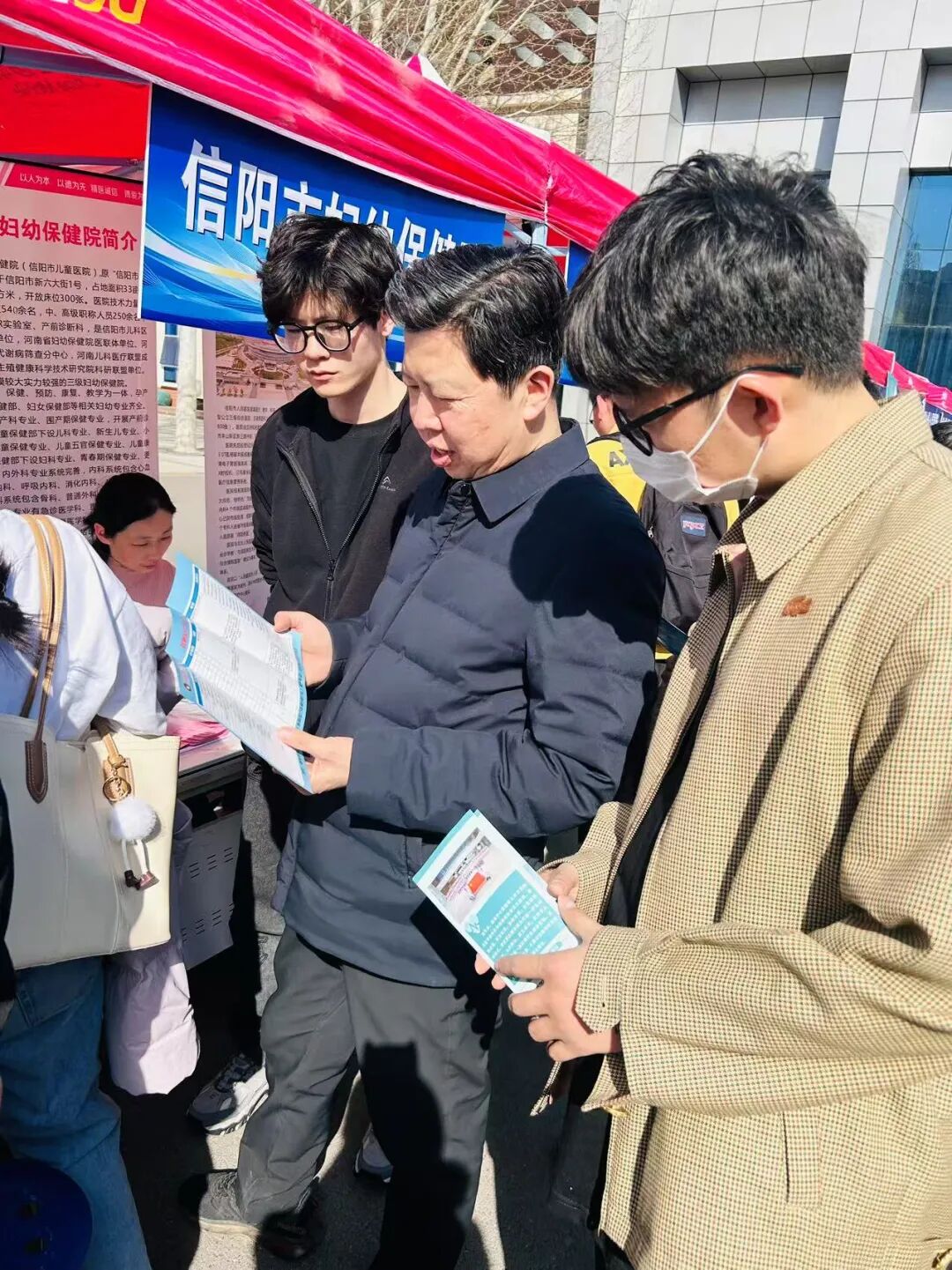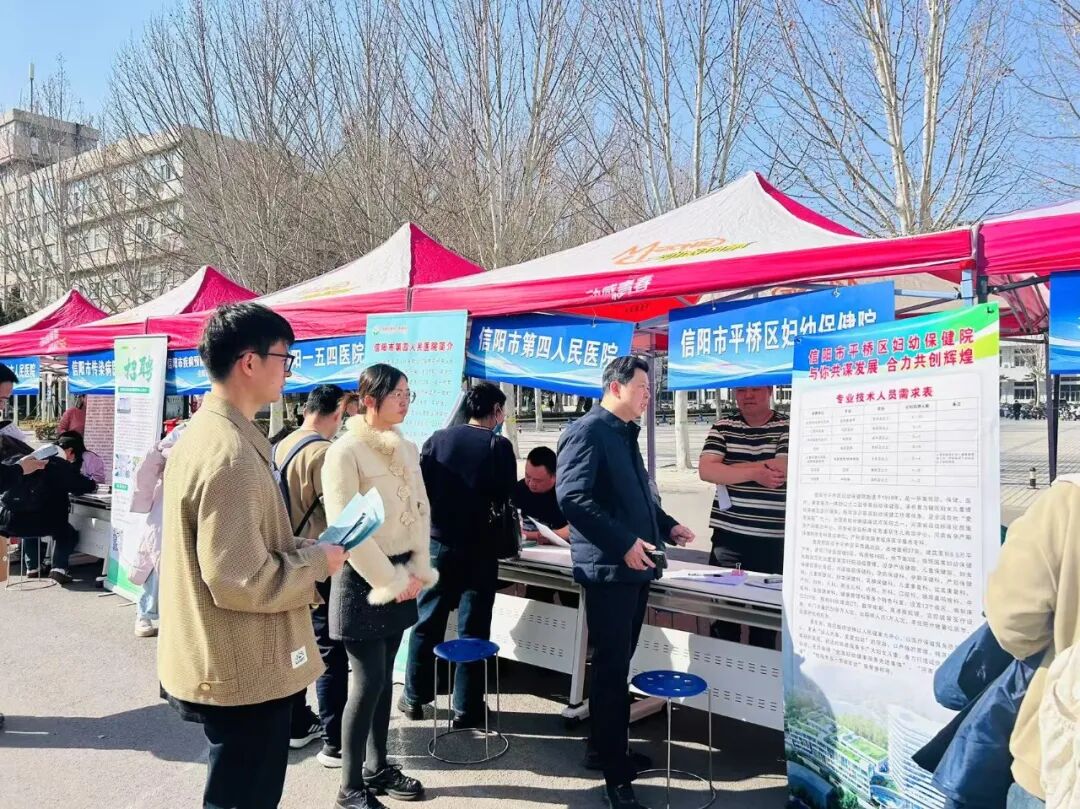 为深入贯彻落实教育部"访企拓岗促就业"专项行动,深化校企合作,拓宽毕业生就业渠道,3月21日下午,我校主动“搭台引企”,邀请信阳市中心医院、信阳市人民医院等18家市县两级医疗机构走进校园,在华亿在线体育(中国)官方网站南校区五环广场前举办医疗卫生领域专场招聘会。18家医疗机构携数百余个岗位进校揽才,吸引临床医学、麻醉学、公共卫生等专业毕业生到场求职。麻醉学院党总支副书记王琰、就业办公室副主任何昊、辅导员刘慧仿到场。