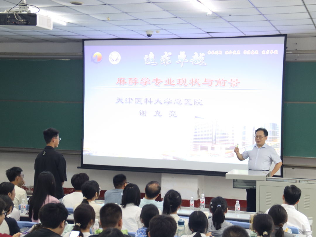 随后,谢克亮教授以《麻醉学专业现状与前景》为题进行了分享。谢克亮教授从为什么选择麻醉学、麻醉学专业现状以及应该如何学好麻醉学等方面进行了深入阐述,劝导同学们珍惜学校提供的丰富学习资源和广阔的发展空间,挺膺医者担当,书写青春篇章。