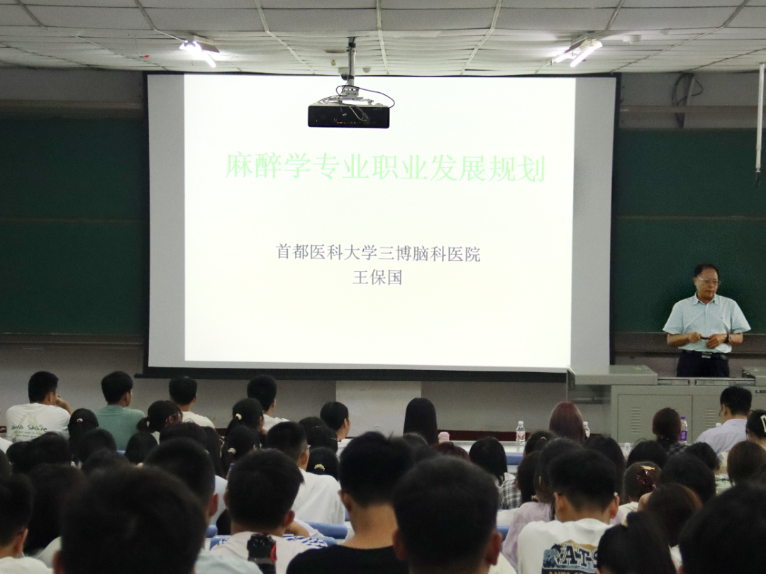 王保国教授带来了《麻醉学专业职业发展规划》的精彩讲座。王保国教授简述了中国麻醉学的历史,并与同学们进行了热切交流。他强调临床医师应具备敬业精神和团结协作能力,鼓励同学们要做一个“自信、勤奋、充实”的人,树立明确的工作和生活目标,做好人生管理。